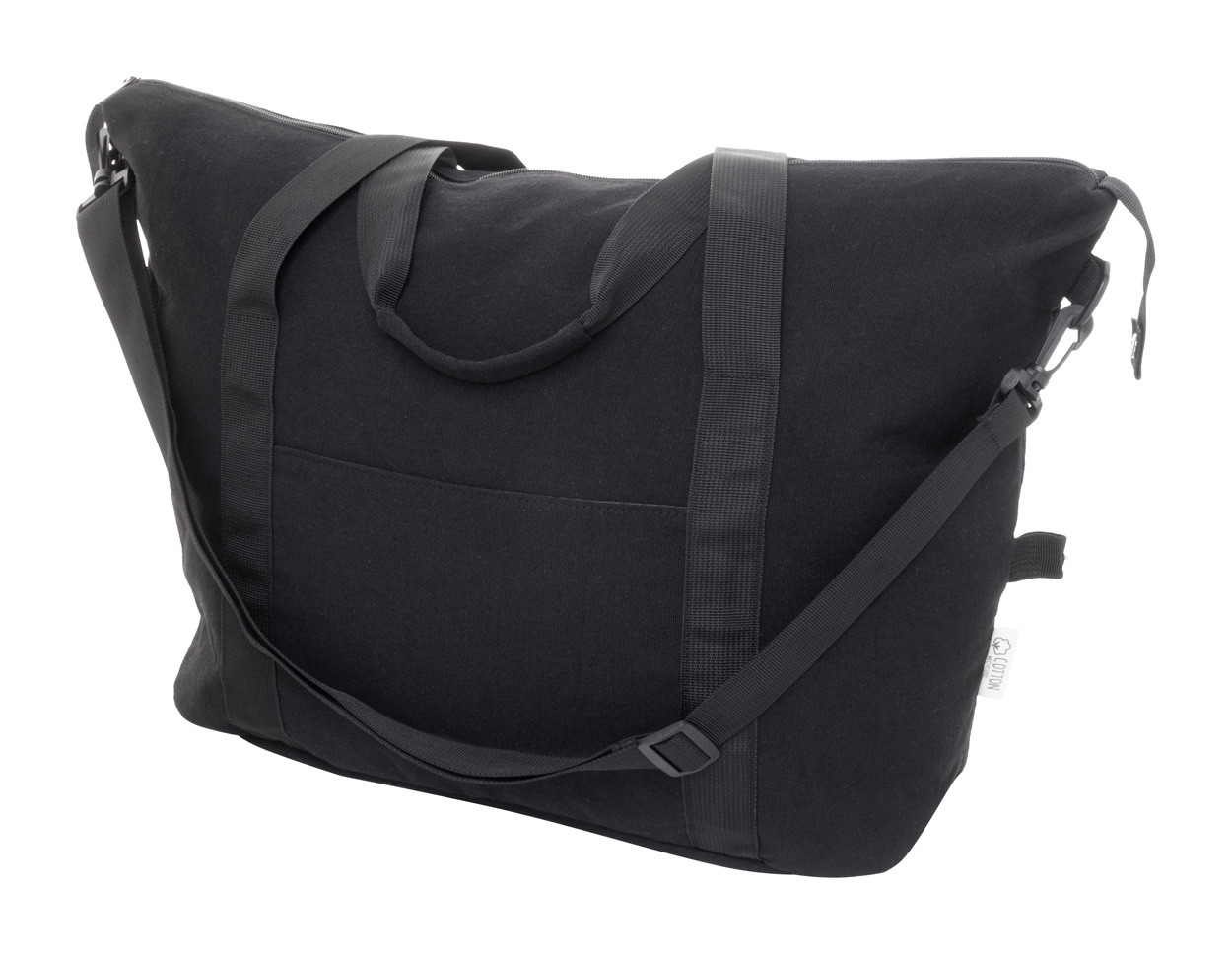 Recycled canvas travel / sports bag with zipped main compartment, front pocket, adjustable shoulder strap and zipped back pocket which doubles as trolley strap. 70% recycled cotton and 30% RPET polyester. With distinctive recycled cotton label.