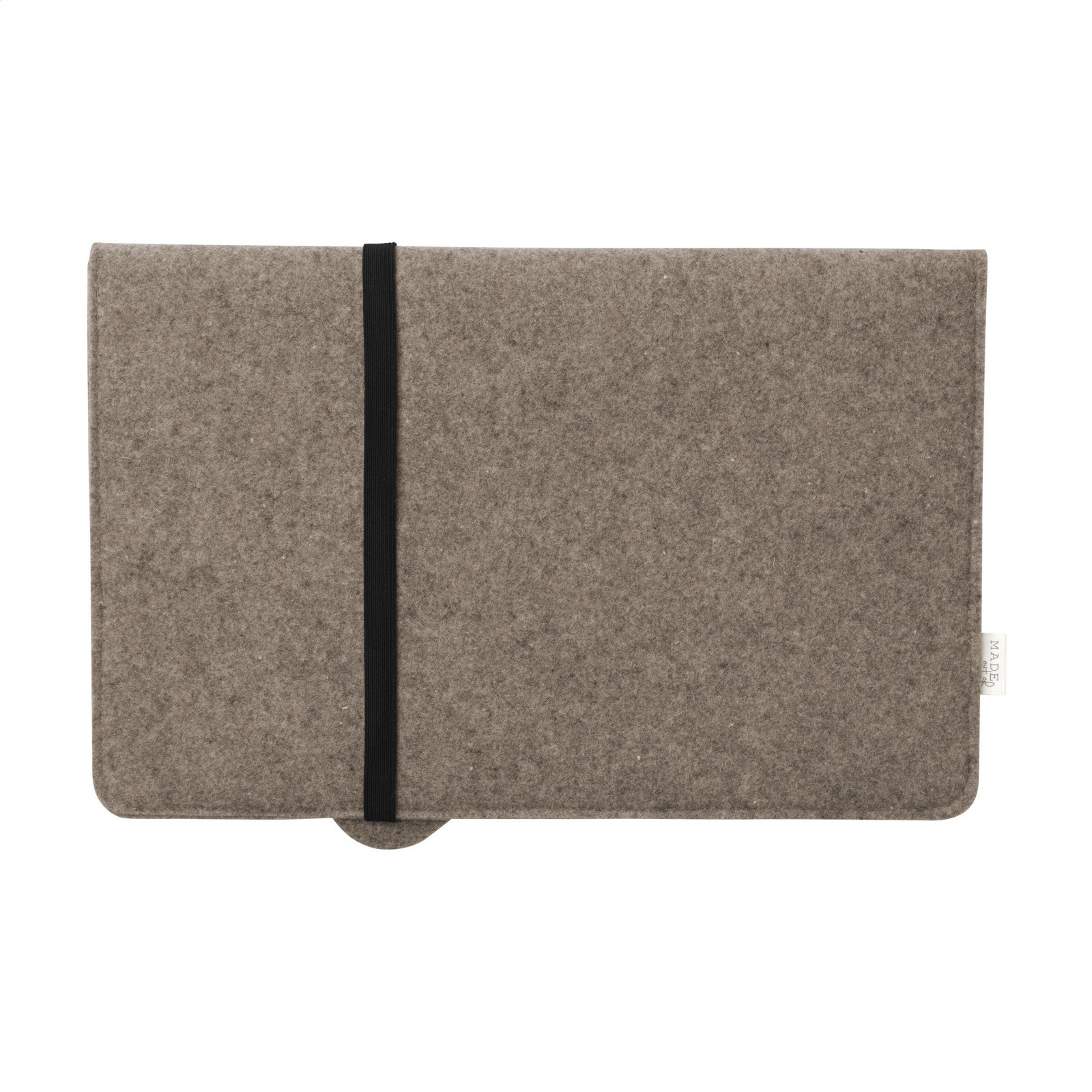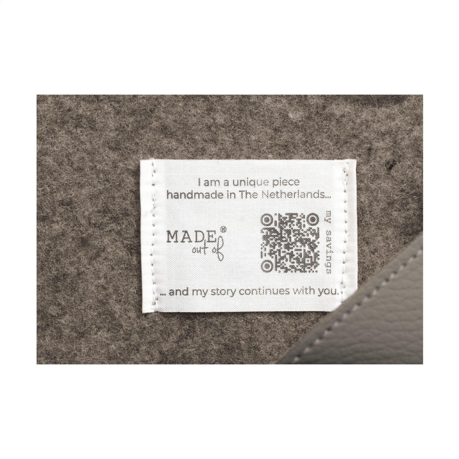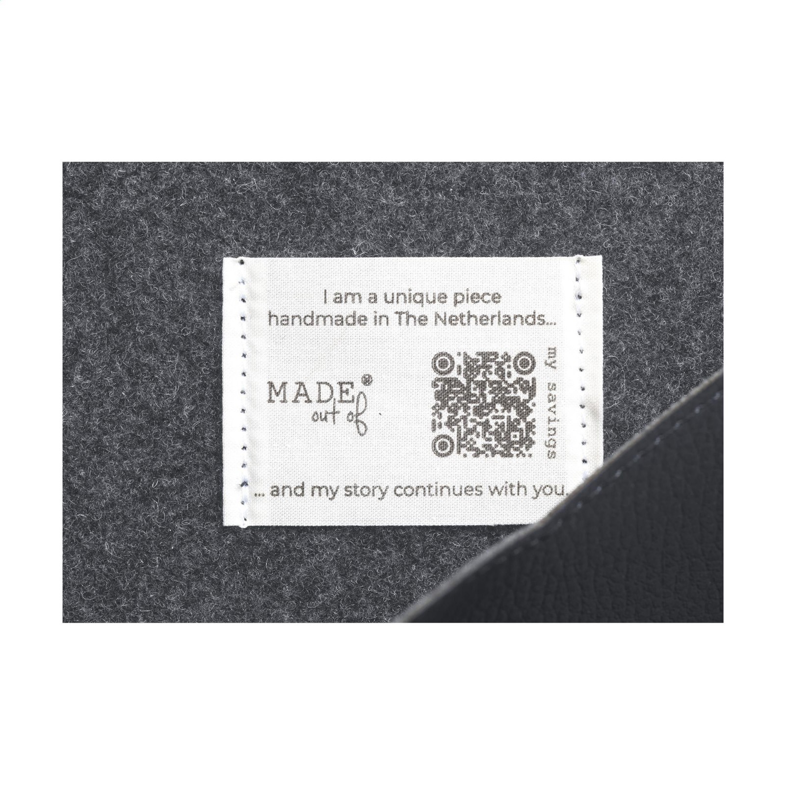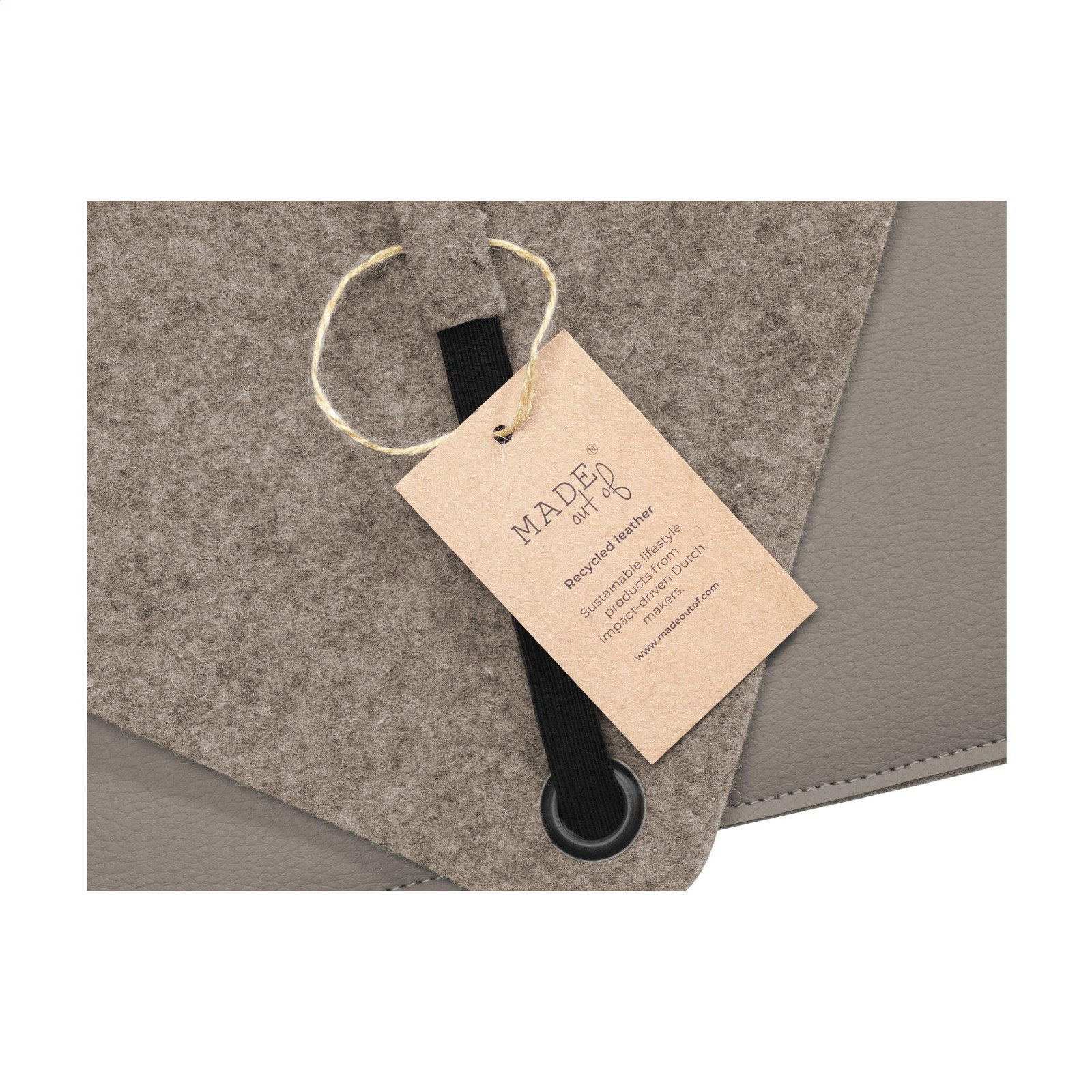 This stylish, designer 15/16-inch laptop sleeve is made from a combination of vegan leather and recycled wool felt. The vegan leather is a plant-based alternative to leather and made from recycled apple pulp. It has the look and feel of real leather. The recycled wool felt is made from 50% recycled content, 30% wool and 20% PE. A stylish product from the MADE out of brand. Designed for the safe storage and transport of a laptop. This laptop sleeve has a handy elastic closure made from cotton and natural biodegradable rubber. The extra storage compartment has enough space for storing a charger and documents. This material carries the Global Recycled Standard quality mark. Handmade. Dutch design. Made in Holland. The skilful reuse of materials gives them a new lease of life and, at the same time, complies with the principles of the circular economy. The ragging process reduces garments to recycled fibres, separated by colour and type. At the end of the production process, the tuft looks like freshly shorn wool. The material is produced in Italy.