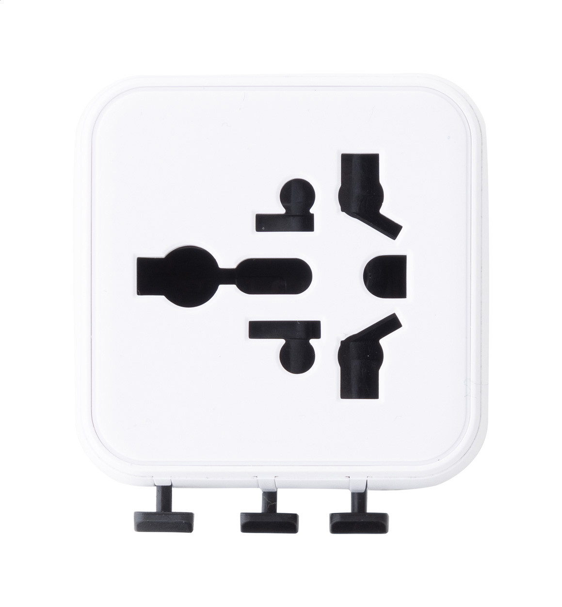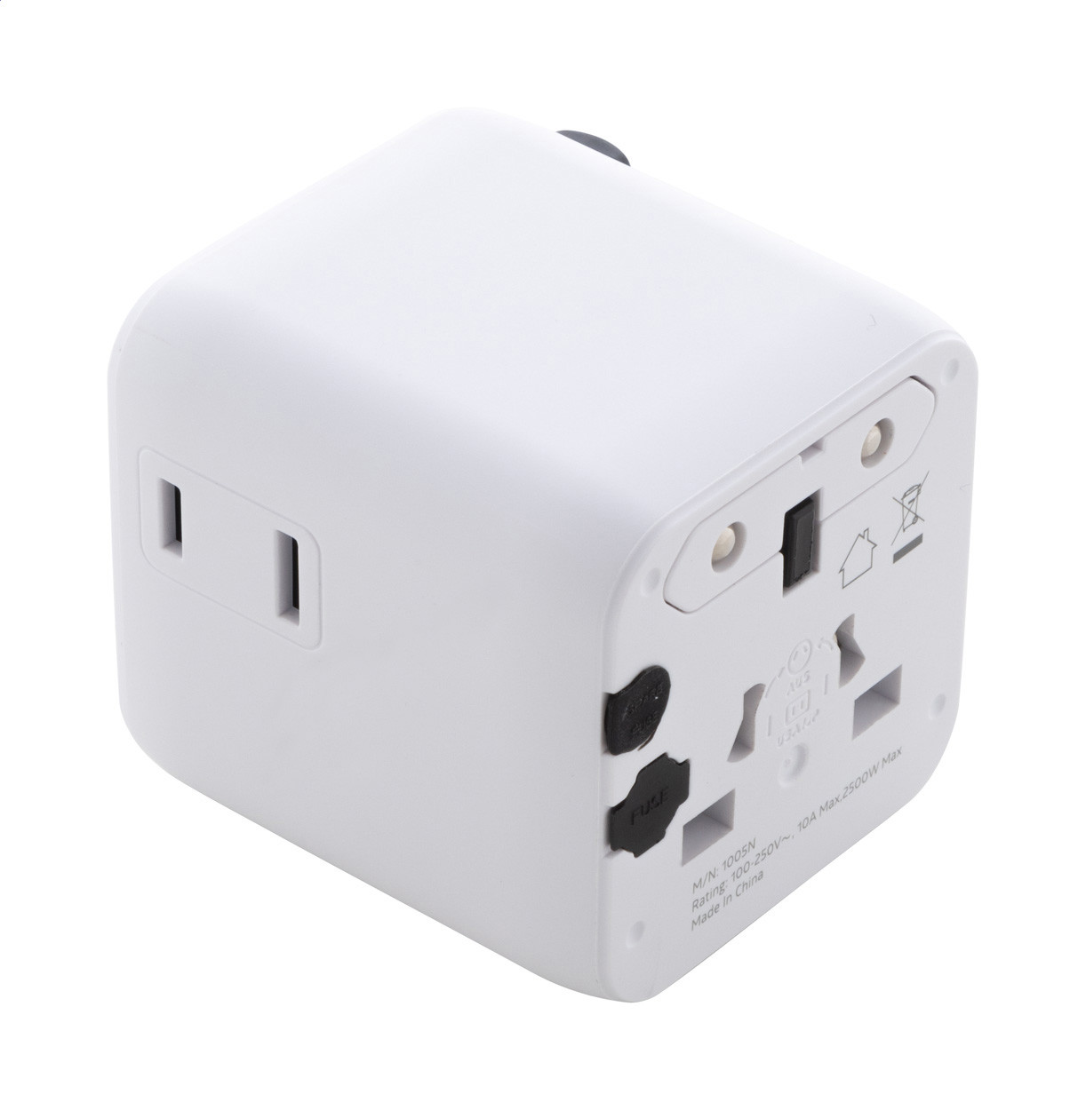 Ultra compact, universal world-wide travel adapter in recycled PC plastic, with built-in wall plugs for USA, Europe, UK and Australia.