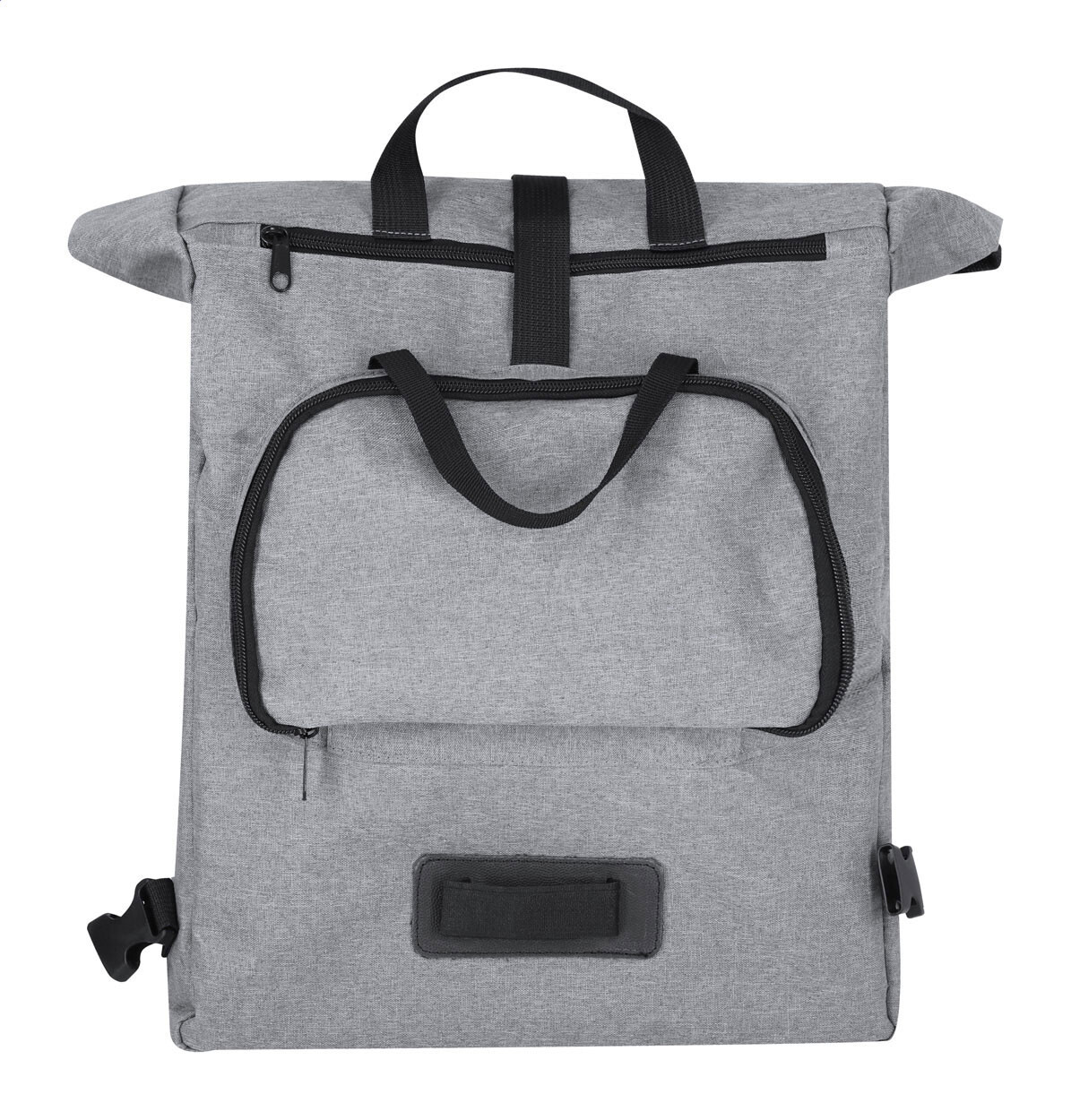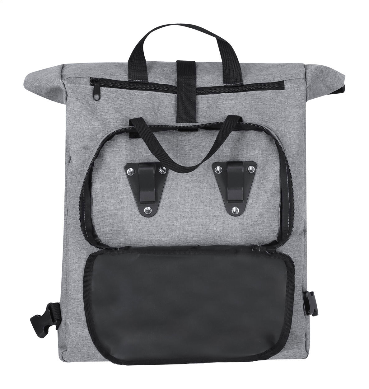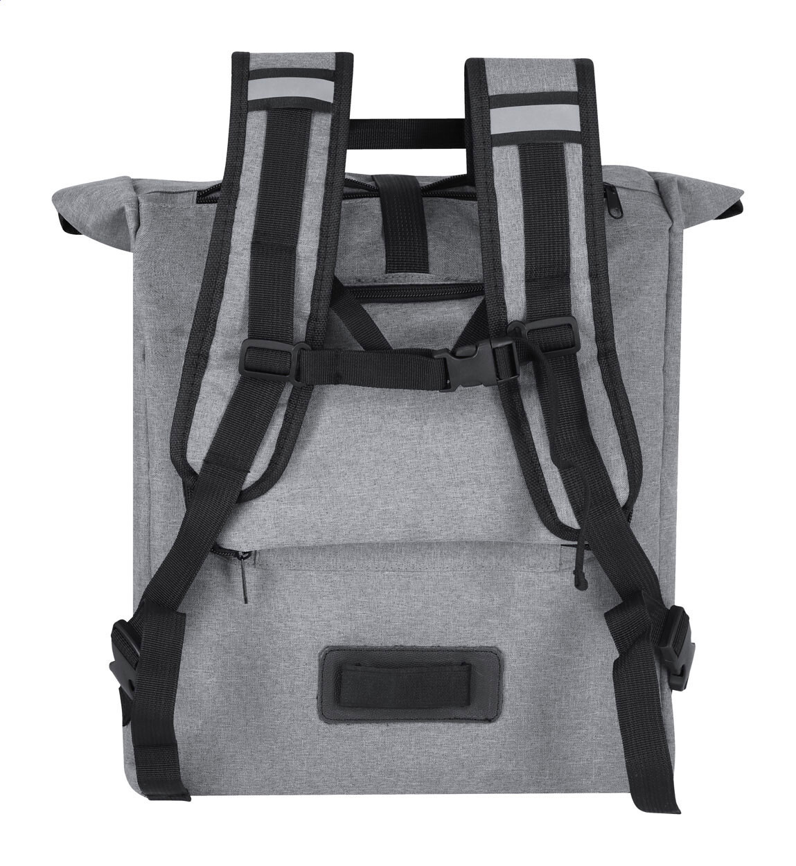 600D RPET polyester bicycle backpack with zipped front pocket and detachable padded shoulder straps. With hidden frame-mounting clamps.