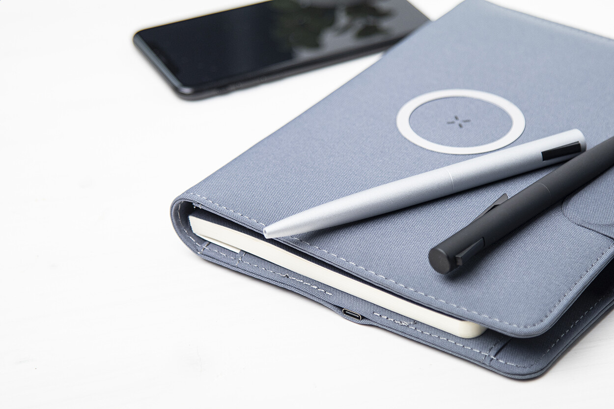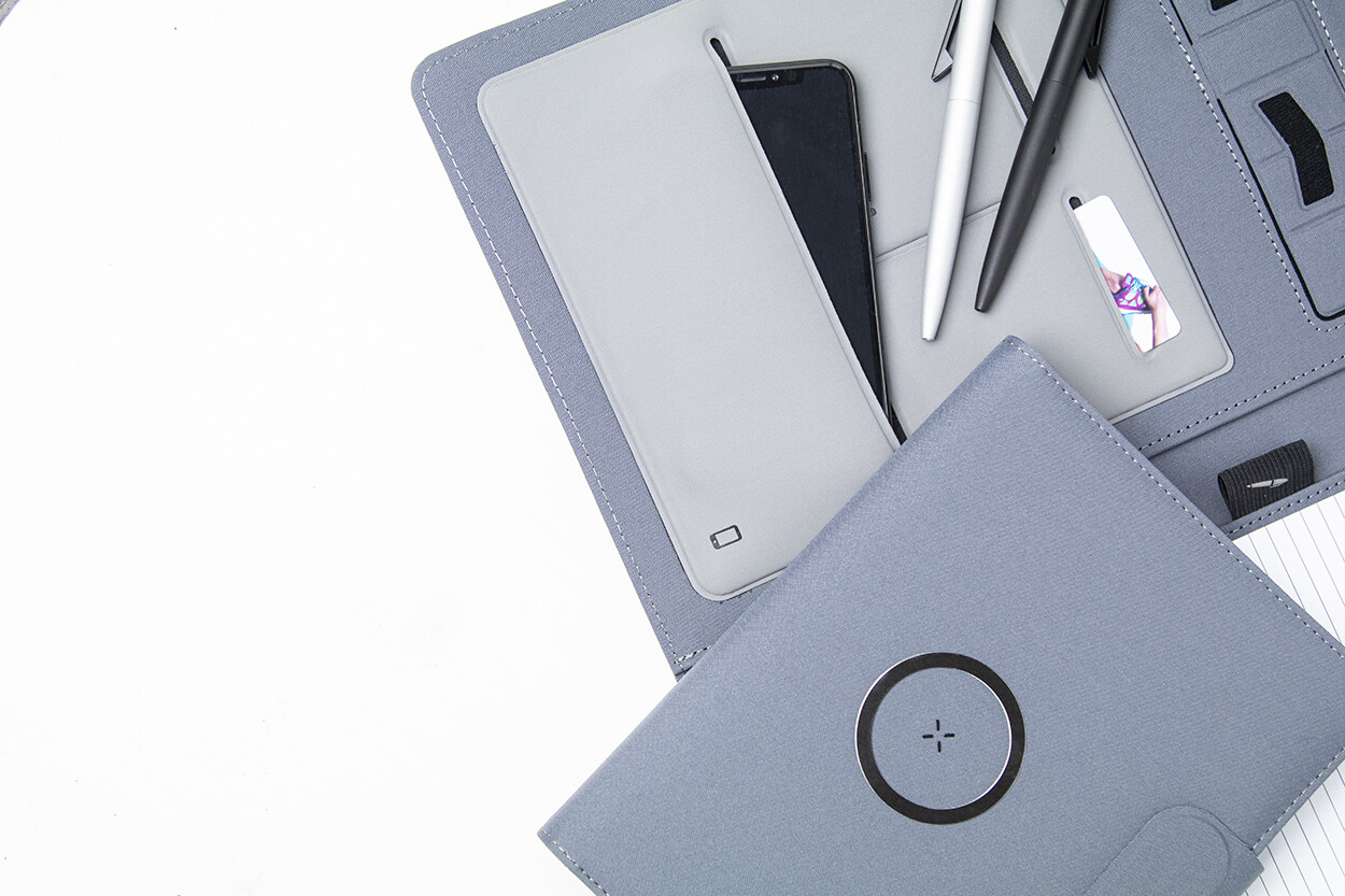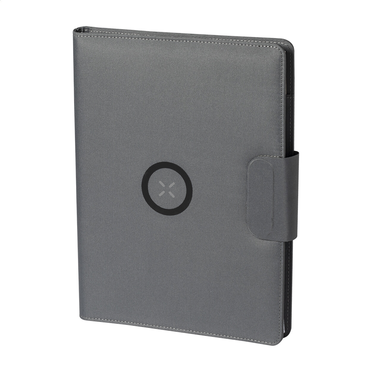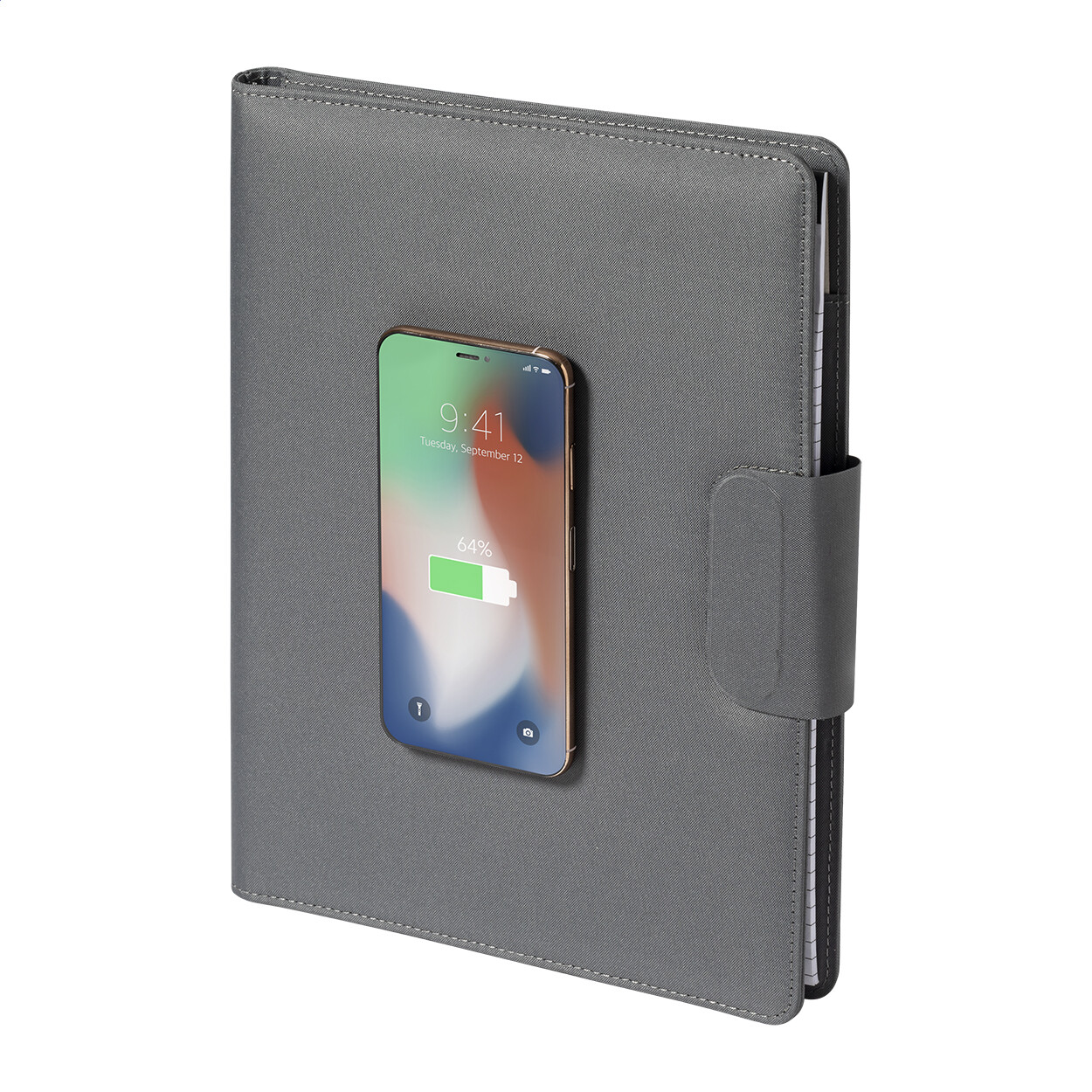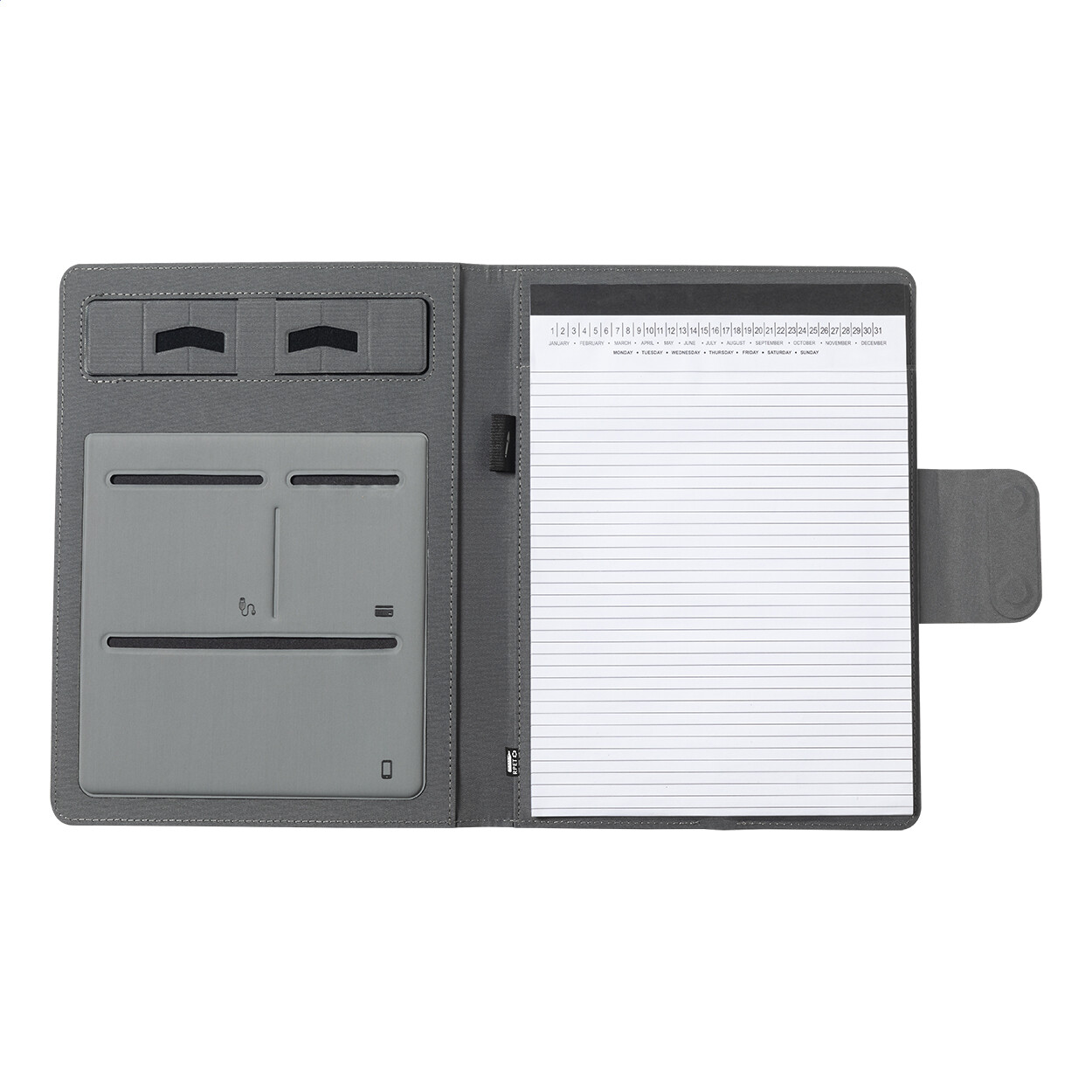 A4 sized, 300D RPET polyester document folder with built-in magnetic wireless fast charger (10W), 5000 mAh power bank with USB charger port, foldable mobile holder and 20 lined sheets notepad. Including self-adhesive metal ring to use the magnetic function on any wirelessly chargeable device. Including USB charger cable.