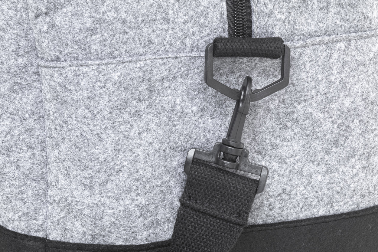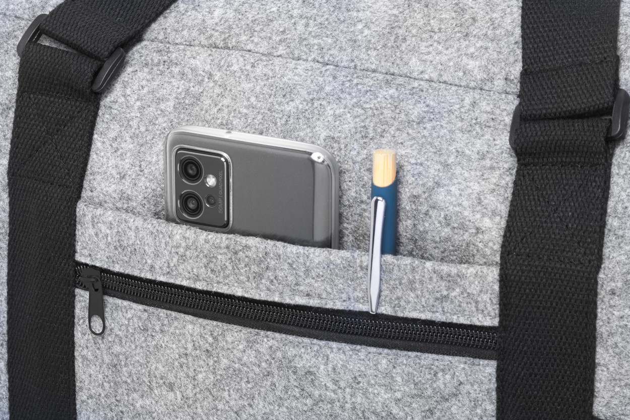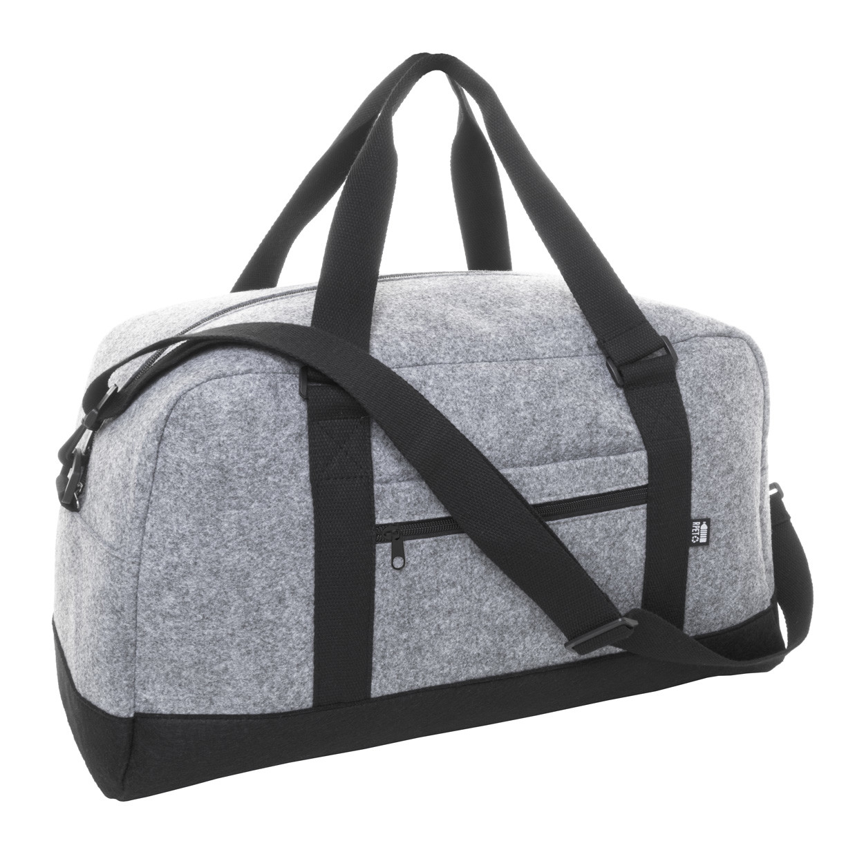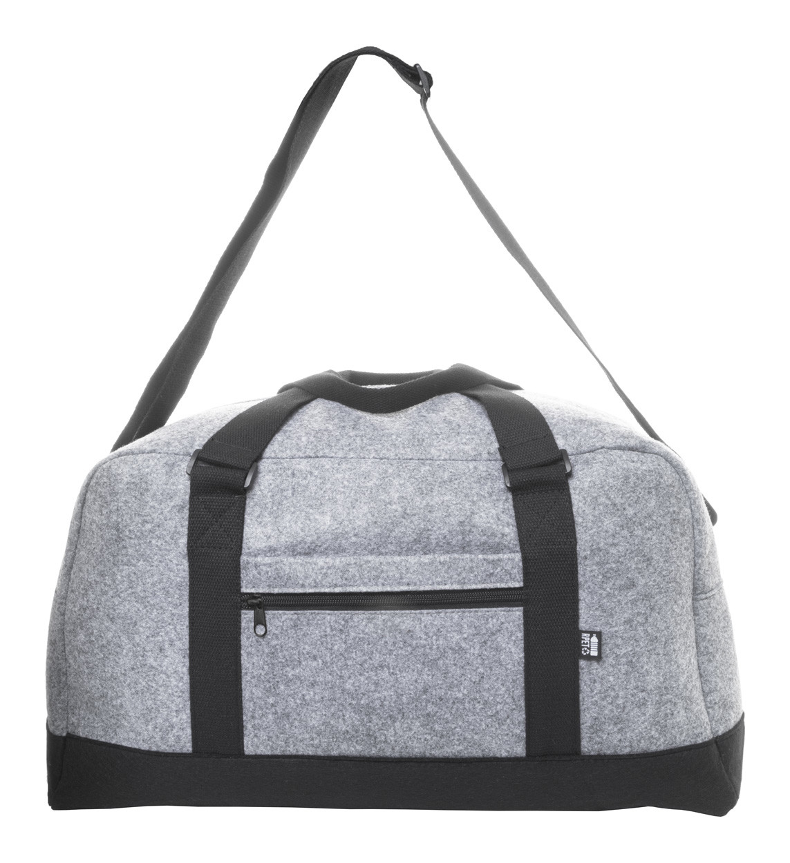 Two-tone RPET felt sports bag with zipped main compartment, zipped front pocket and adjustable shoulder strap. With distinctive RPET label.