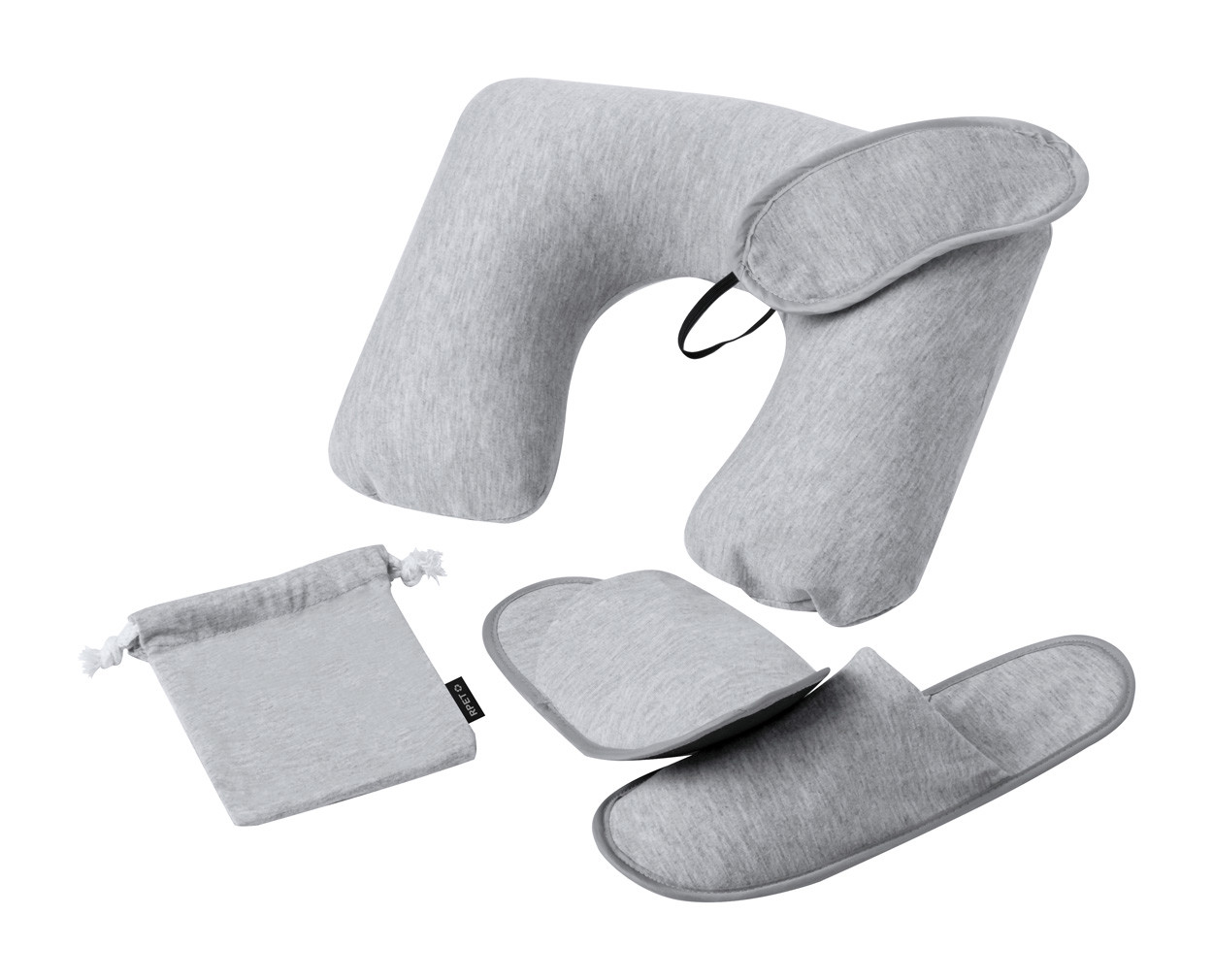 RPET polyester travel set in drawstring pouch. Including inflatable travel pillow, eye mask and slippers in one size (36-43).