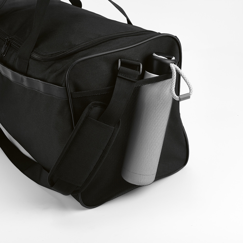 Sao Paulo L spacious 50L gym bag in rPET. This bag features one main compartment and a hidden zippered front pocket for secure storage. It includes an open side pocket and a mesh pocket on the other side for easy access to essentials. A contrast reflective strap adds style and visibility while concealing the front pocket. Finished with padded webbing handles and an adjustable shoulder strap with padding for comfortable carrying.