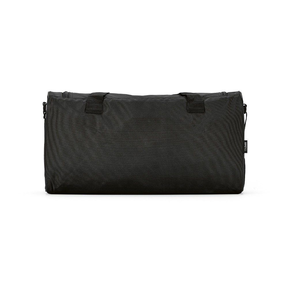 Sao Paulo M gym bag in rPET ripstop with 25L capacity. It features one spacious main compartment and a hidden zippered front pocket, ideal for keeping valuables secure and out of sight. It includes an open pocket on one side and a mesh pocket on the opposite side, perfect for holding a water bottle or quick-access items. A contrast reflective strap adds a modern touch while cleverly concealing the front pocket, combining style with smart functionality.