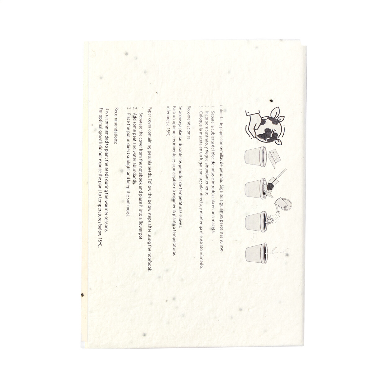 Seed paper covered sticky notepad with 25 notes and 125 page markers (in 5 different colours). The seed paper cover contains petunia seeds in assorted colours, which can be planted by separating the cover from the notepad.