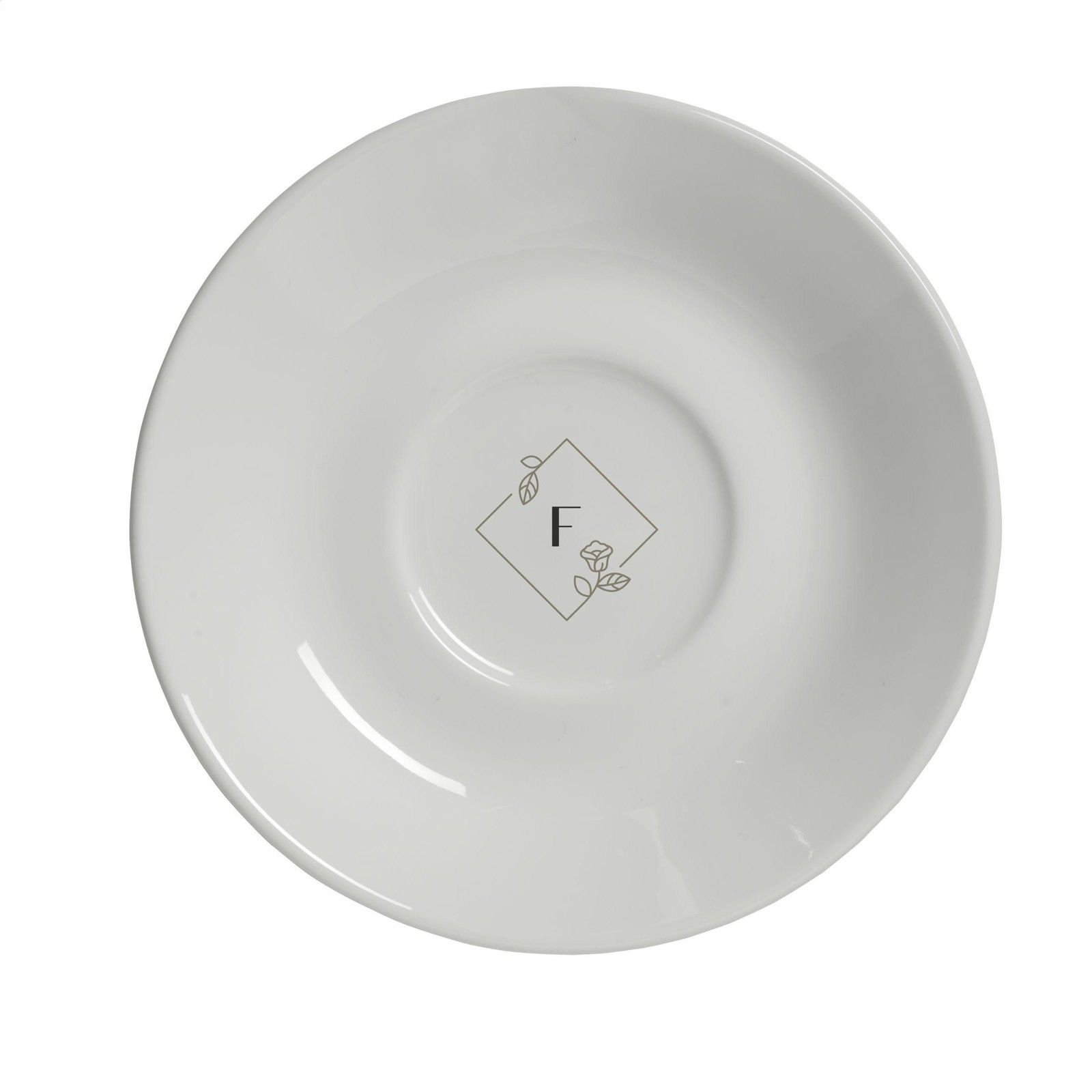 High-quality ceramic cup and saucer, ideal for cappucinos. Dishwasher safe. The imprint is dishwasher tested and certified: EN 12875-2. Dim. cup 6 x Ø 9.5 cm. Dim. saucer Ø 14 cm. Capacity 210 ml.
