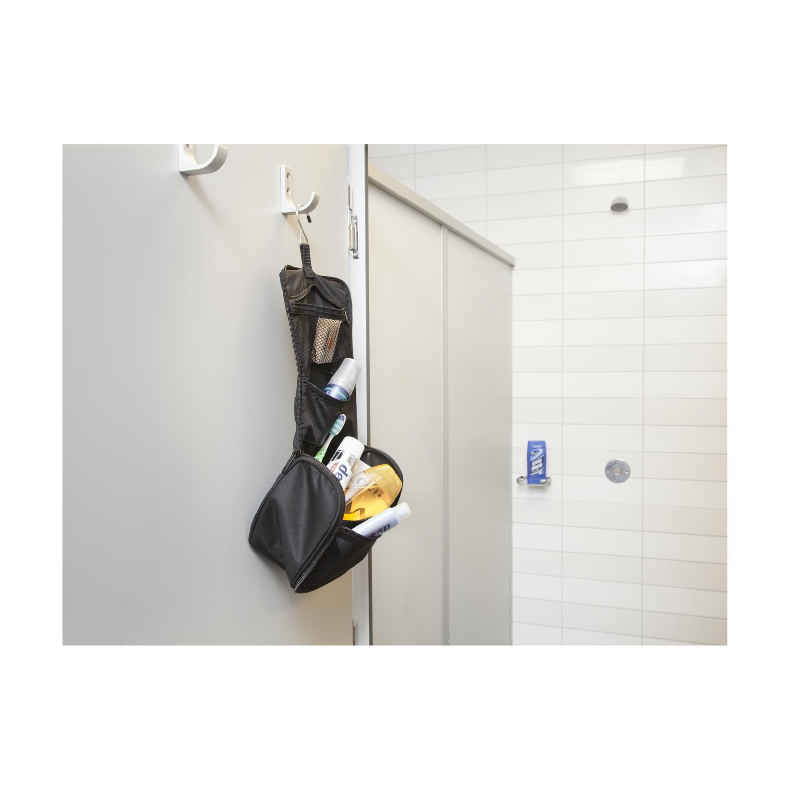 Practical toiletry bag made from strong polyester. With hanger, various zipped pockets, mesh pocket, padded inside and handle.