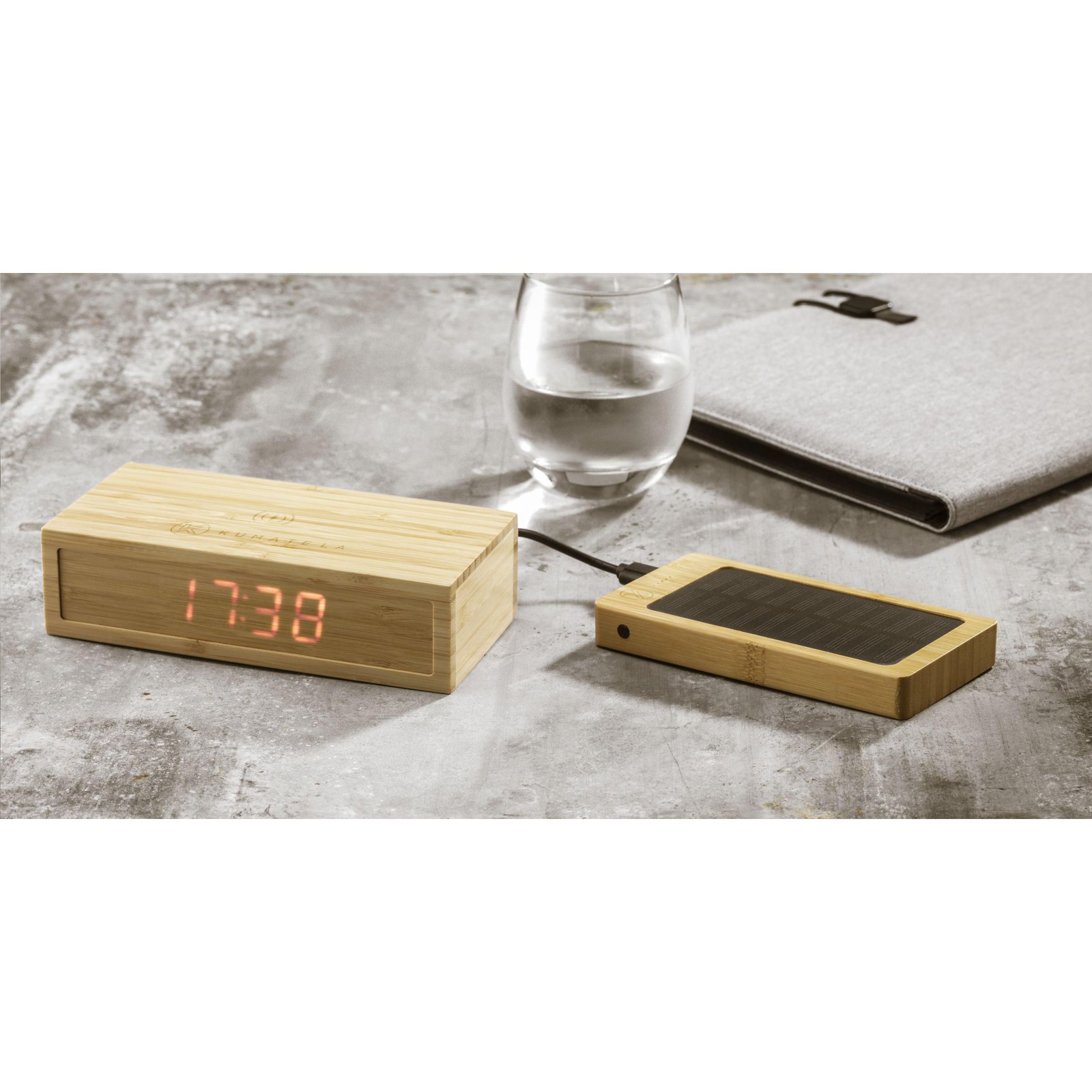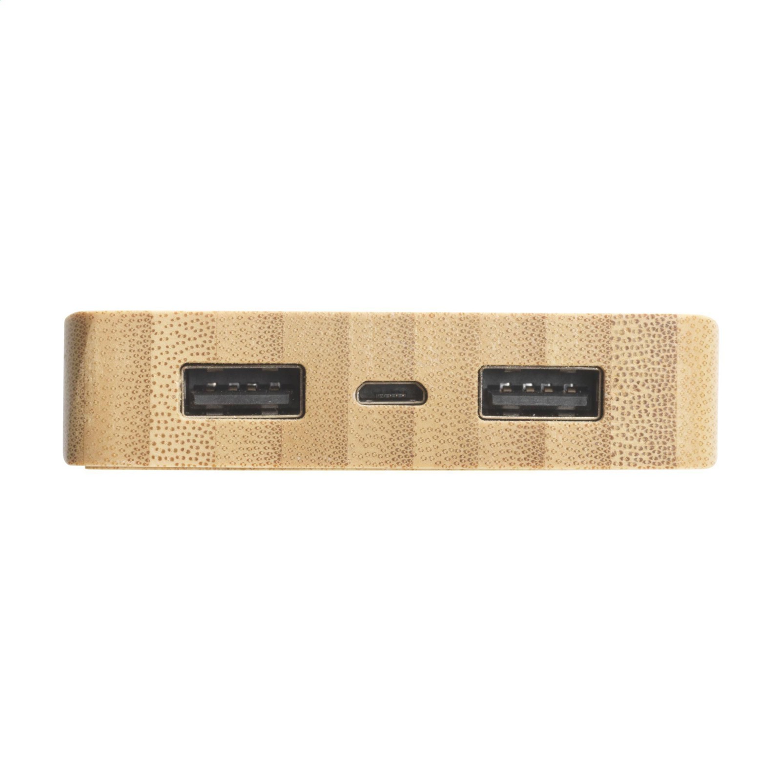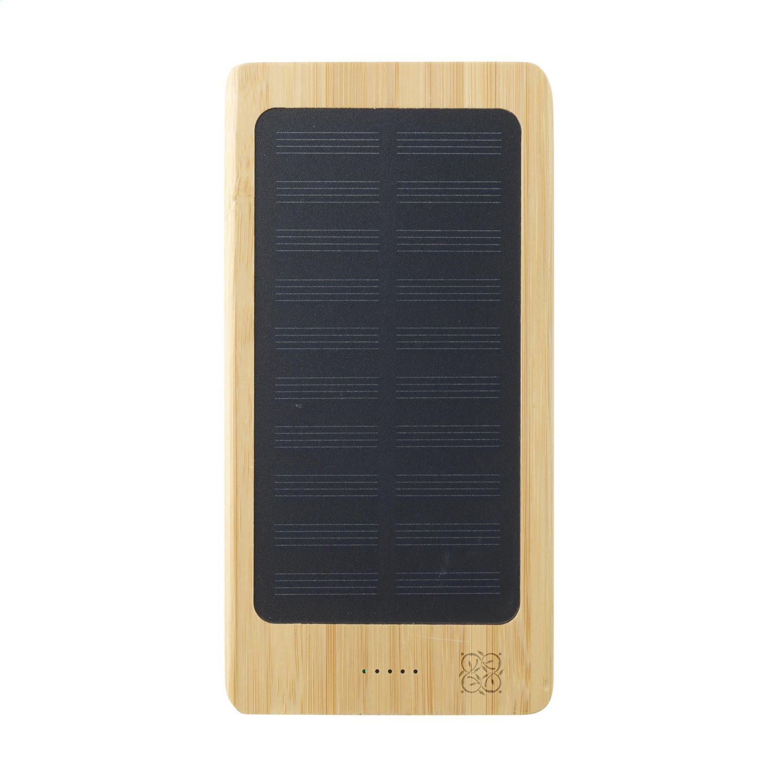 Powerful, high-capacity powerbank and wireless charger with natural FSC 100% certified bamboo case. The built-in 8,000 mAh lithium polymer battery can be charged with solar energy or with mains electricity using the USB port. Compatible with all mobile devices that support QI wireless charging (newest generations Android and iPhone). Input: 5V/2A. Output: 5V/2A. Includes USB-C charging cable and user manual. Packed individually.