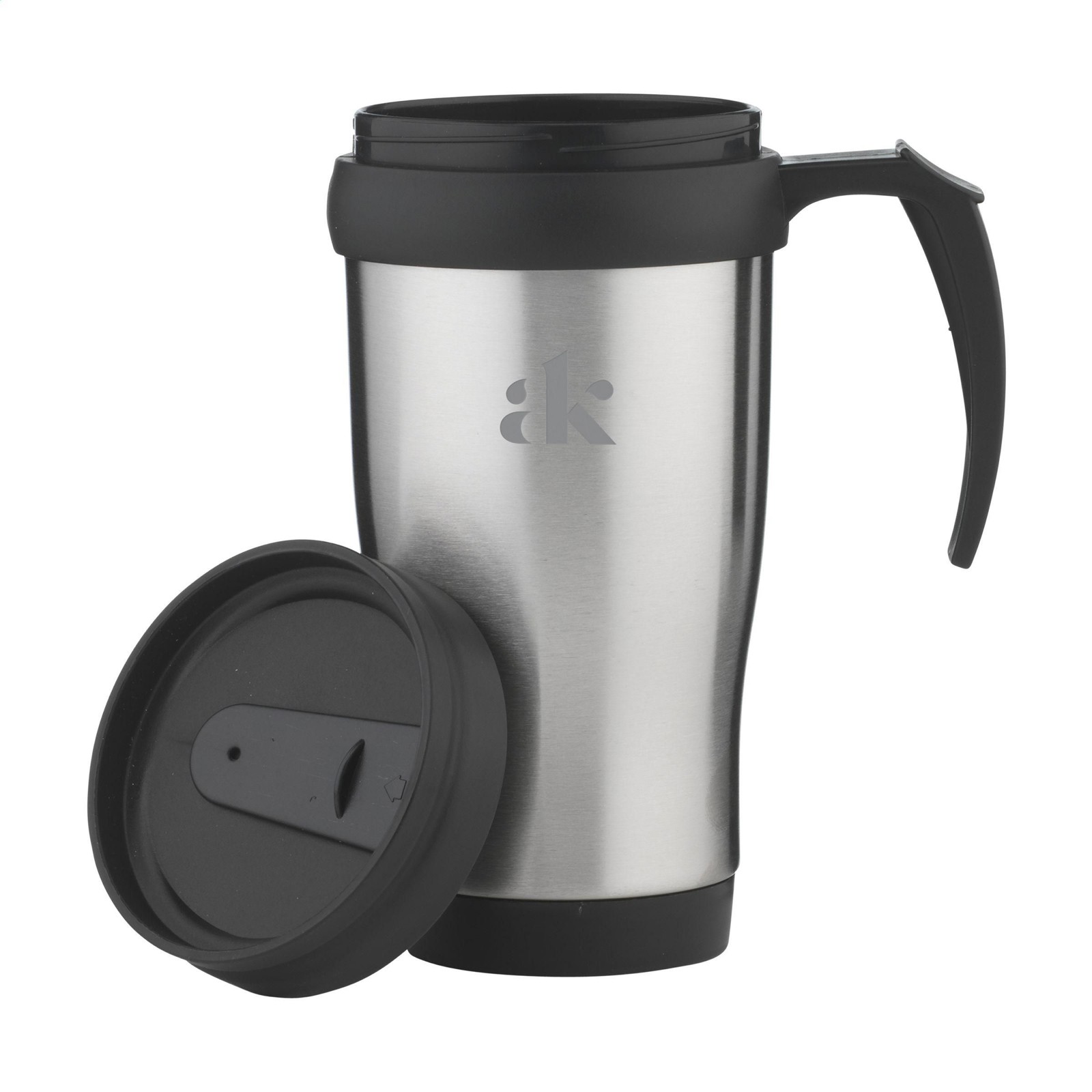 Double-walled stainless steel and plastic thermo mug with screw top lid and slide/click opening. Not dishwasher-safe. Capacity 400 ml. Packed individually.