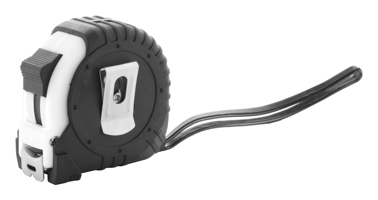Tape measure made from recycled ABS plastic. With hardened steel strap (band width 19 mm) and measure displayed in both centimetres and inches. Comes with non-slip rubber housing, belt clip and wrist strap. Packed individually.