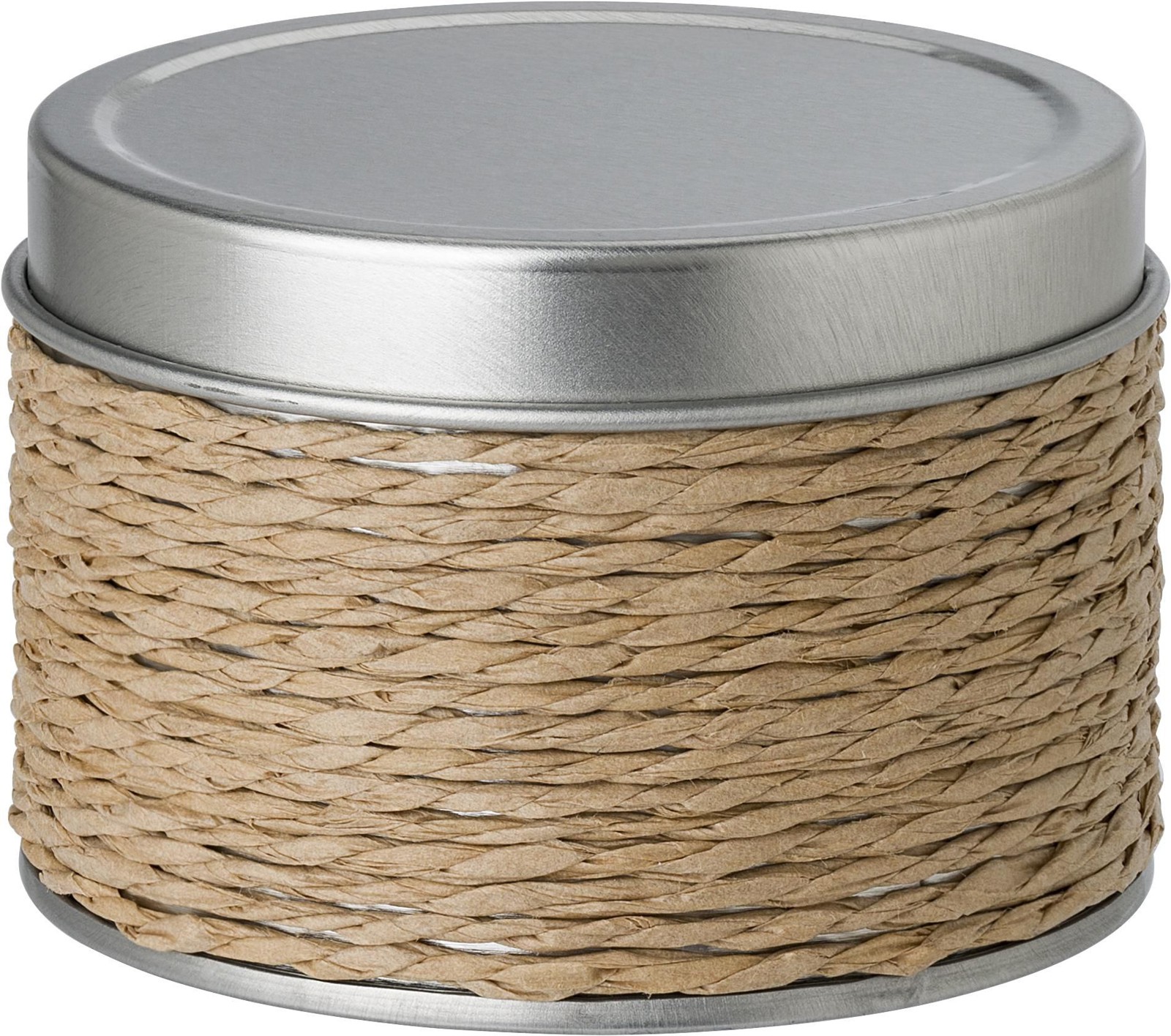 Tin can with scented candle. Aromas: 02/vanilla, 08/Apple-cinnamon and 13/cinnamon.