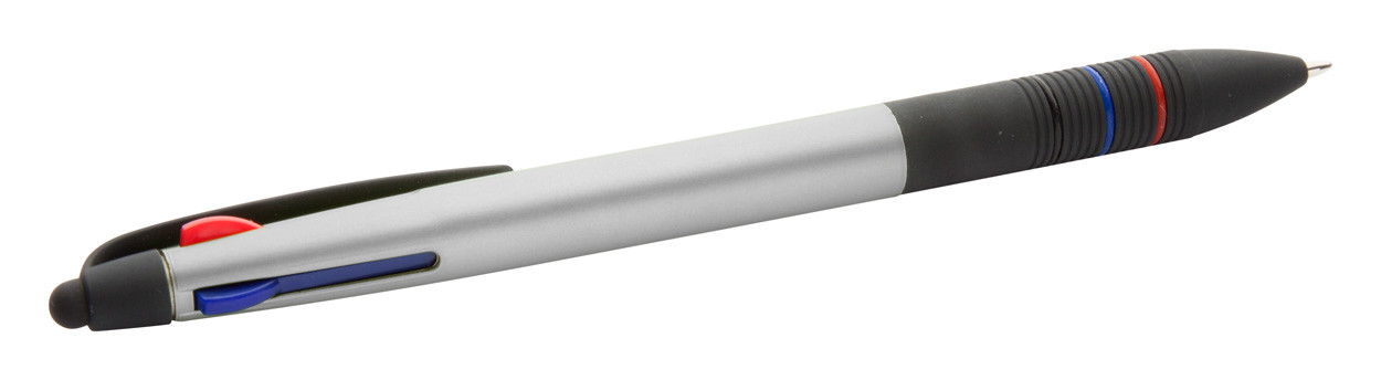 Plastic ballpoint and touch screen pen with rubberized grip and matte metallic finish. With 3 coloured refills: black, blue and red.