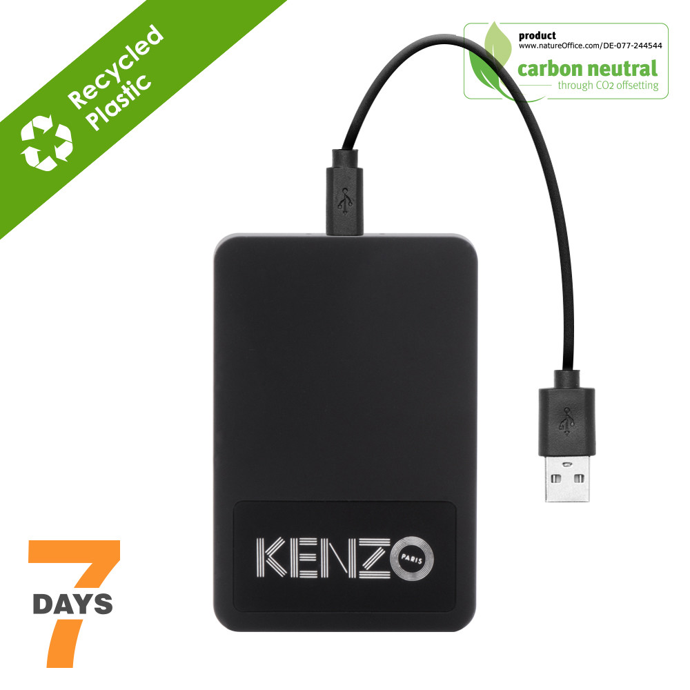 Very complete wireless charging power bank with built-in Li-ion battery (8,000 mAh). The casing is made from 100% RCS-certified recycled ABS. With regular output, type-C input and 5W wireless charging technology. Wireless charging for mobile devices that support Qi wireless charging (newest generation Android and iPhones generation 8 and above). Input: DC5V/2.1A. Output USB: DC5V/2.1A. Wireless output: DC5V/1A. With indicator lights and on/off button. Includes micro-USB charging cable and user manual. RCS-certified. Total recycled material: 25%. Packed individually.