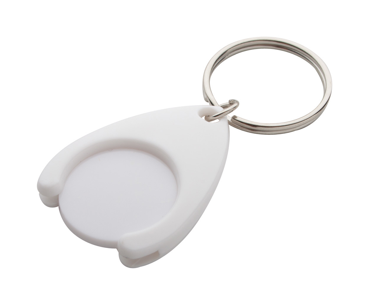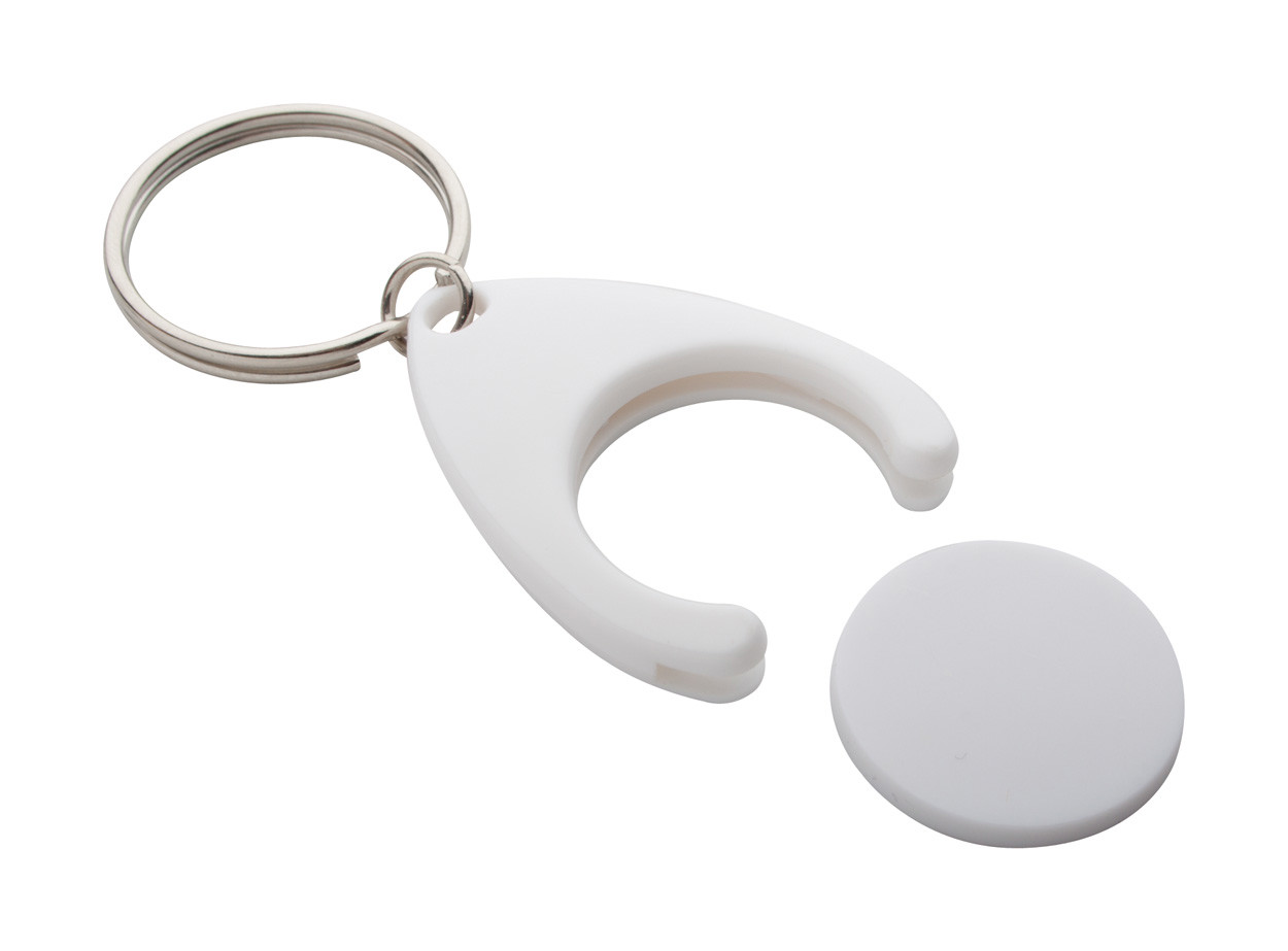 Plastic keyring with shopping trolley coin and metal ring. Coin size: ø24×2 mm.