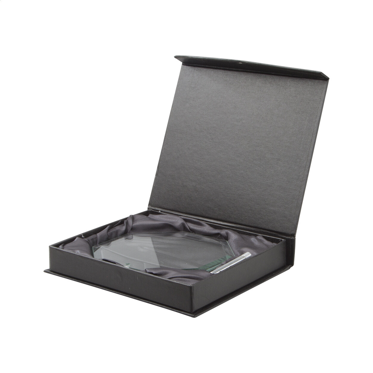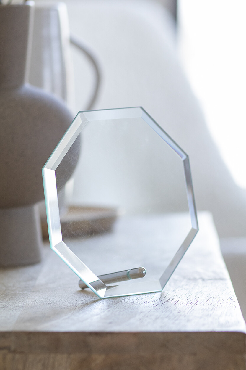 Octagonal glass trophy with holder. Delivered in black gift box.