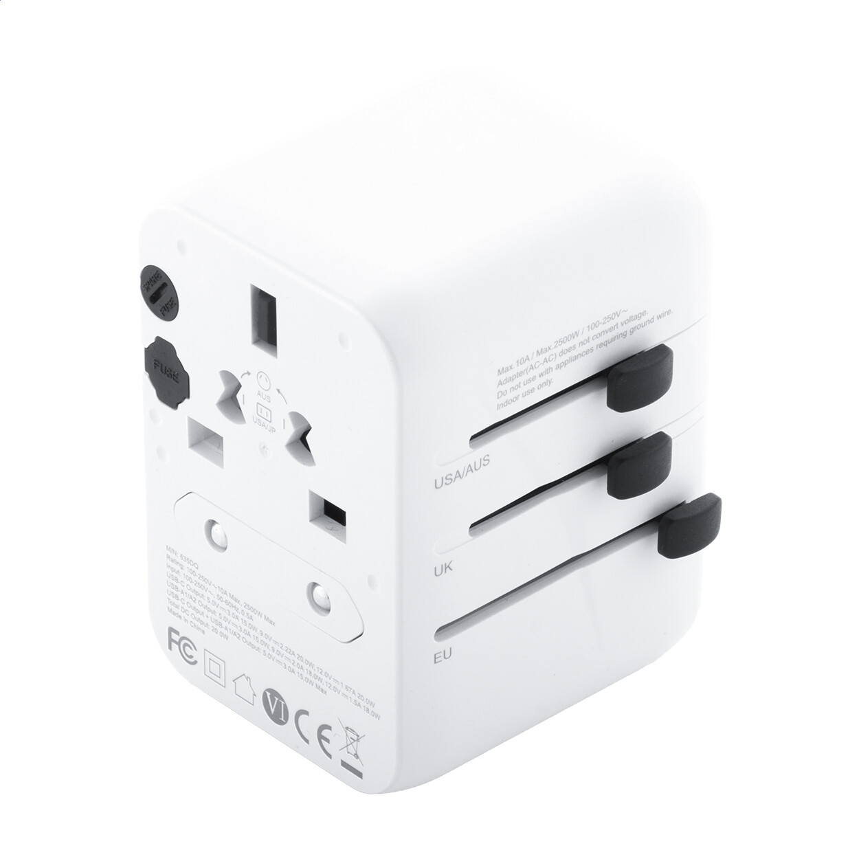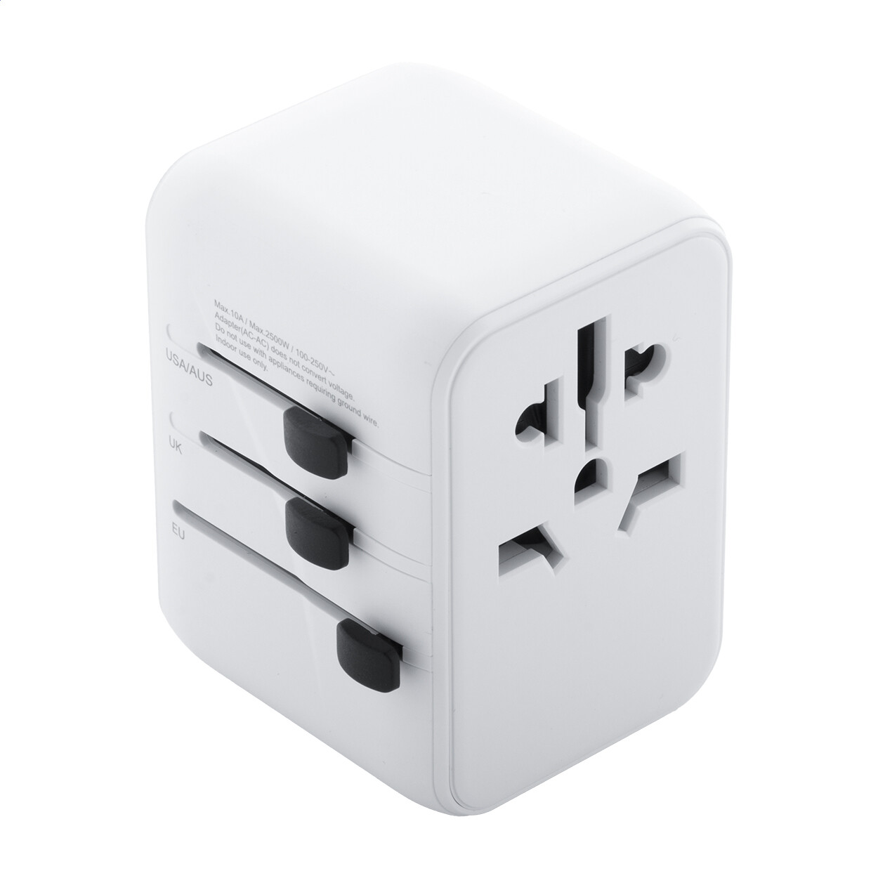 Adaptateur de voyage universel ultra compact en plastique PC recyclé, avec prises murales intégrées pour les États-Unis, l'Europe, le Royaume-Uni et l'Australie.