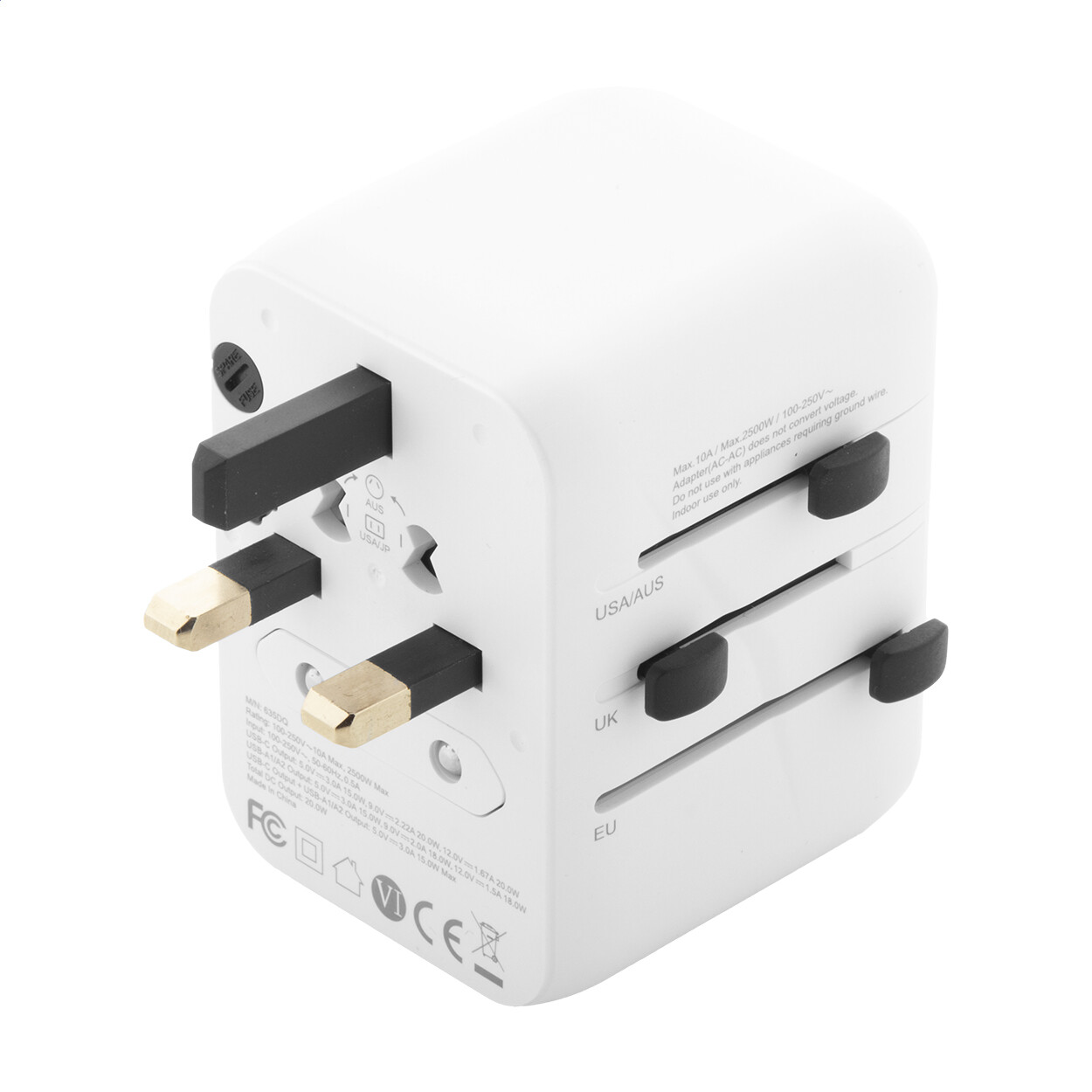 Adaptateur de voyage comprenant deux sorties USB-A, deux sorties Type-C et une sortie Type-C à charge ultra rapide GaN et PD de 33 W . Cet adaptateur est compatible dans 150 pays. Livré avec un étui de voyage.