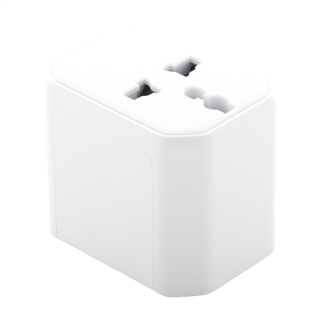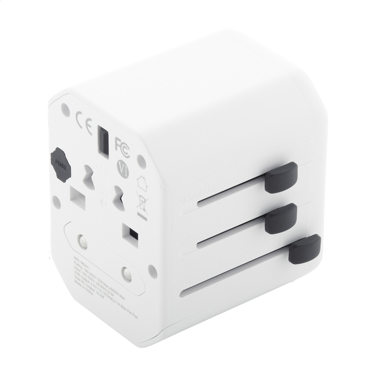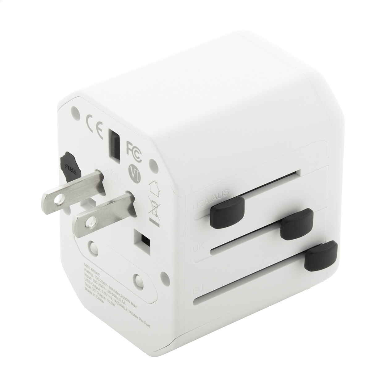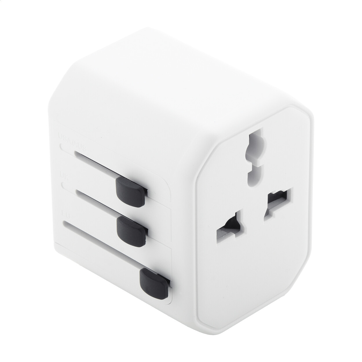 Adaptateur de voyage universel ultra compact en plastique PC recyclé, avec prises murales intégrées pour les États-Unis, l'Europe, le Royaume-Uni et l'Australie.