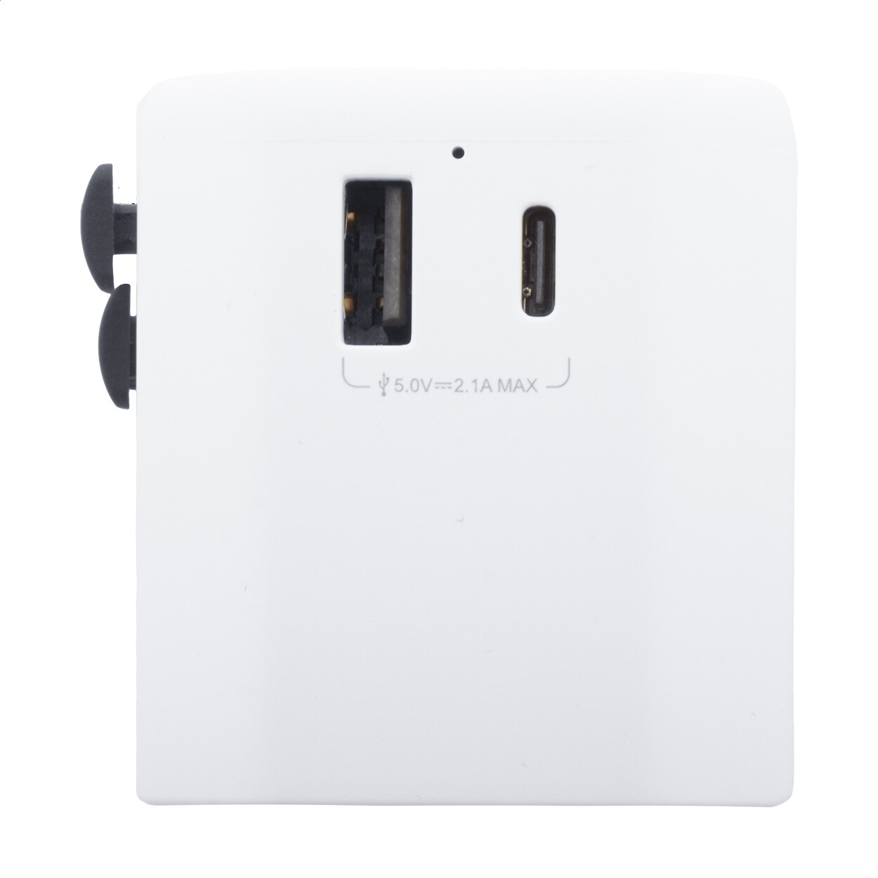 Adaptateur de voyage comprenant deux sorties USB-A, deux sorties Type-C et une sortie Type-C à charge ultra rapide GaN et PD de 33 W . Cet adaptateur est compatible dans 150 pays. Livré avec un étui de voyage.