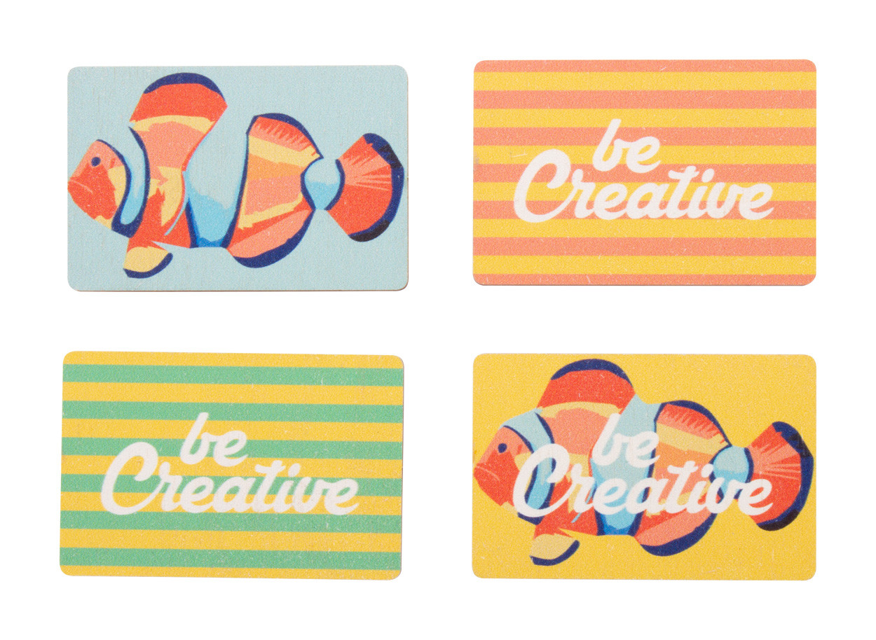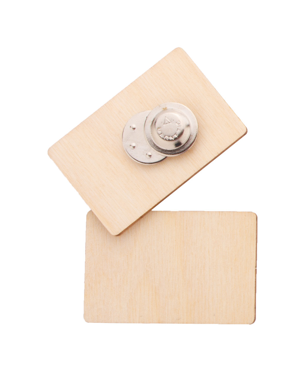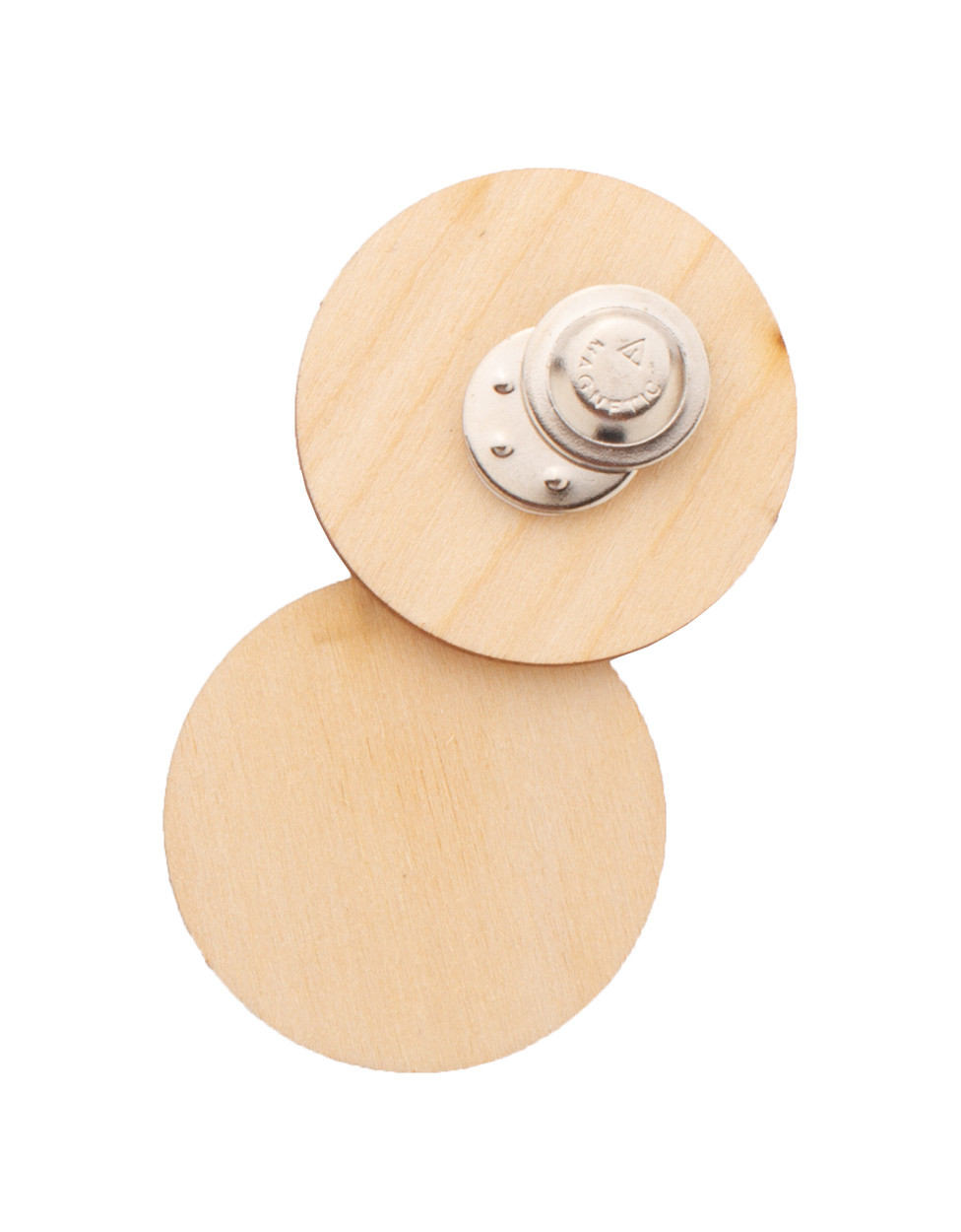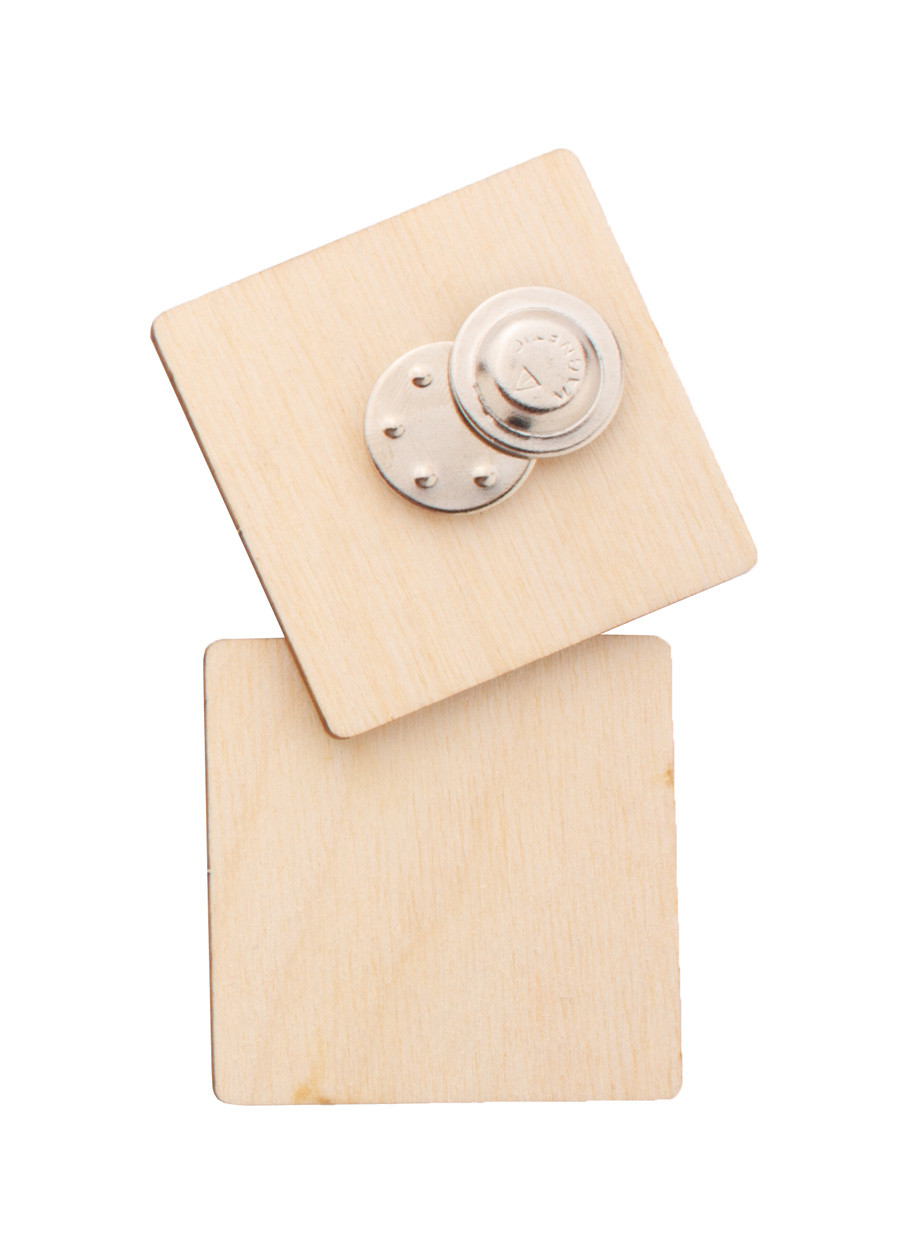 Badge en contreplaqué de bouleau sur mesure impression quadri avec fermeture magnétique. Le prix comprend l'impression en UVLED. Quantité minimale : 100 pièces.