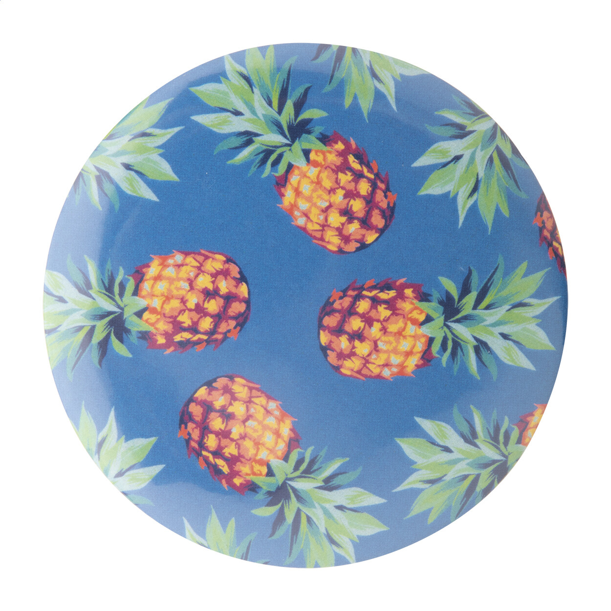 Petit badge à épingle avec insert en polyester RPET impression en quadri. Le prix inclut l´impression en sublimation. Quantité minimale : 100 pièces.