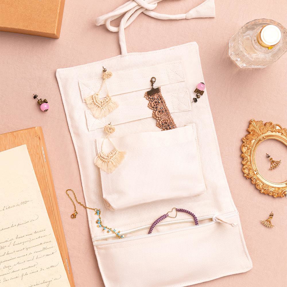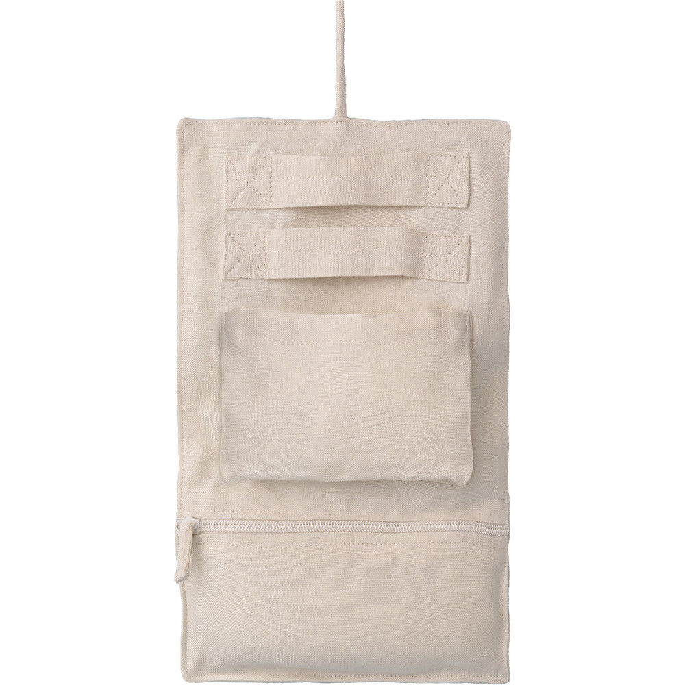 Bijoutier en coton 200 gr/m² avec deux sangles, une poche et une autre avec une fermeture éclair.