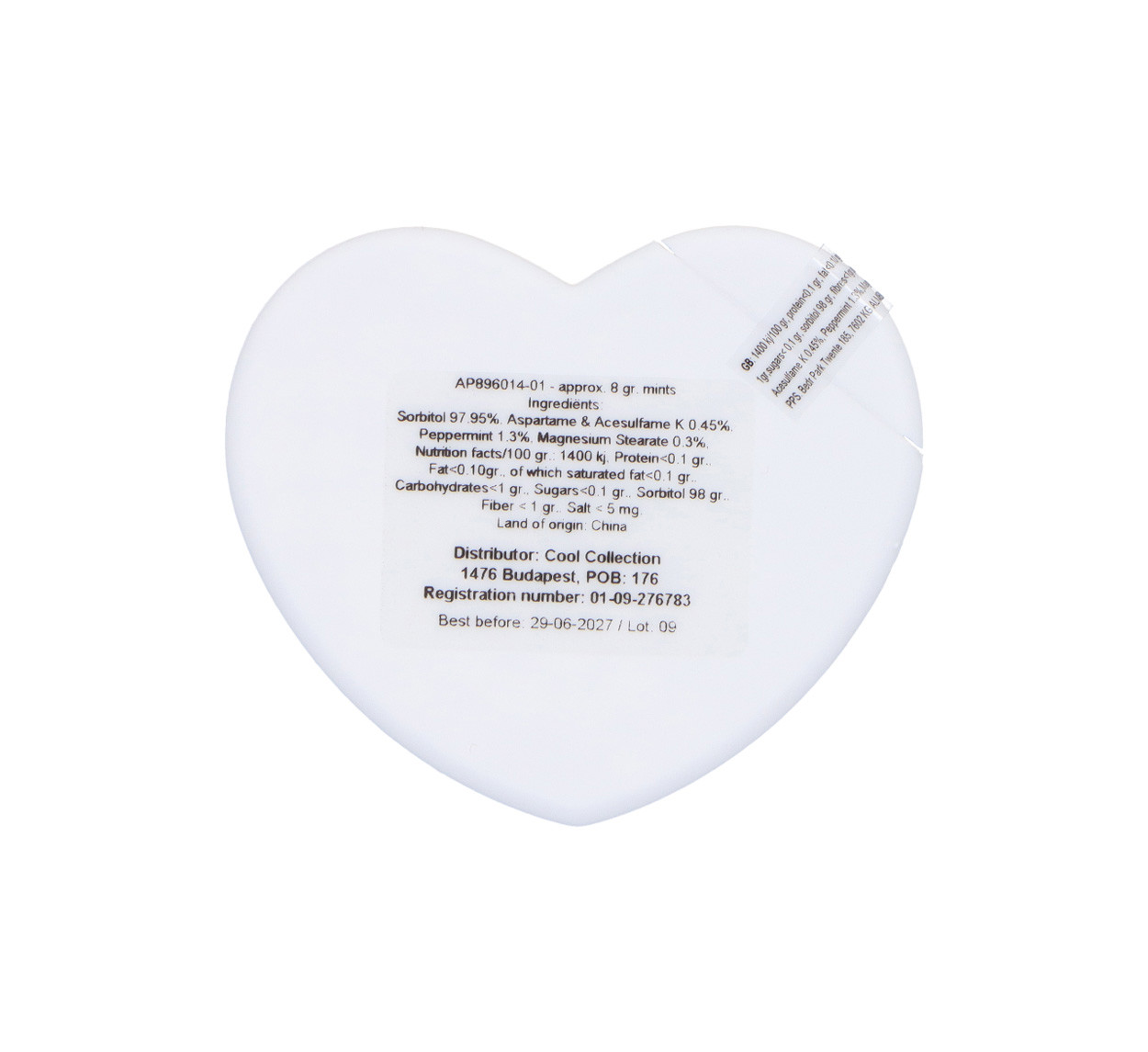 Boîte à bonbons à la menthe en plastique en forme de cœur avec environ 8 grammes de bonbons mentholés sans sucre.