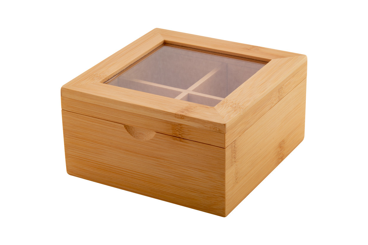 Boîte à thé en bambou avec 4 compartiments et couvercle en acrylique transparent.