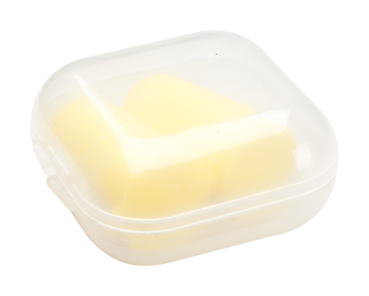 Boules protection auditive en EVA de couleur dans boîte plastique transparente.