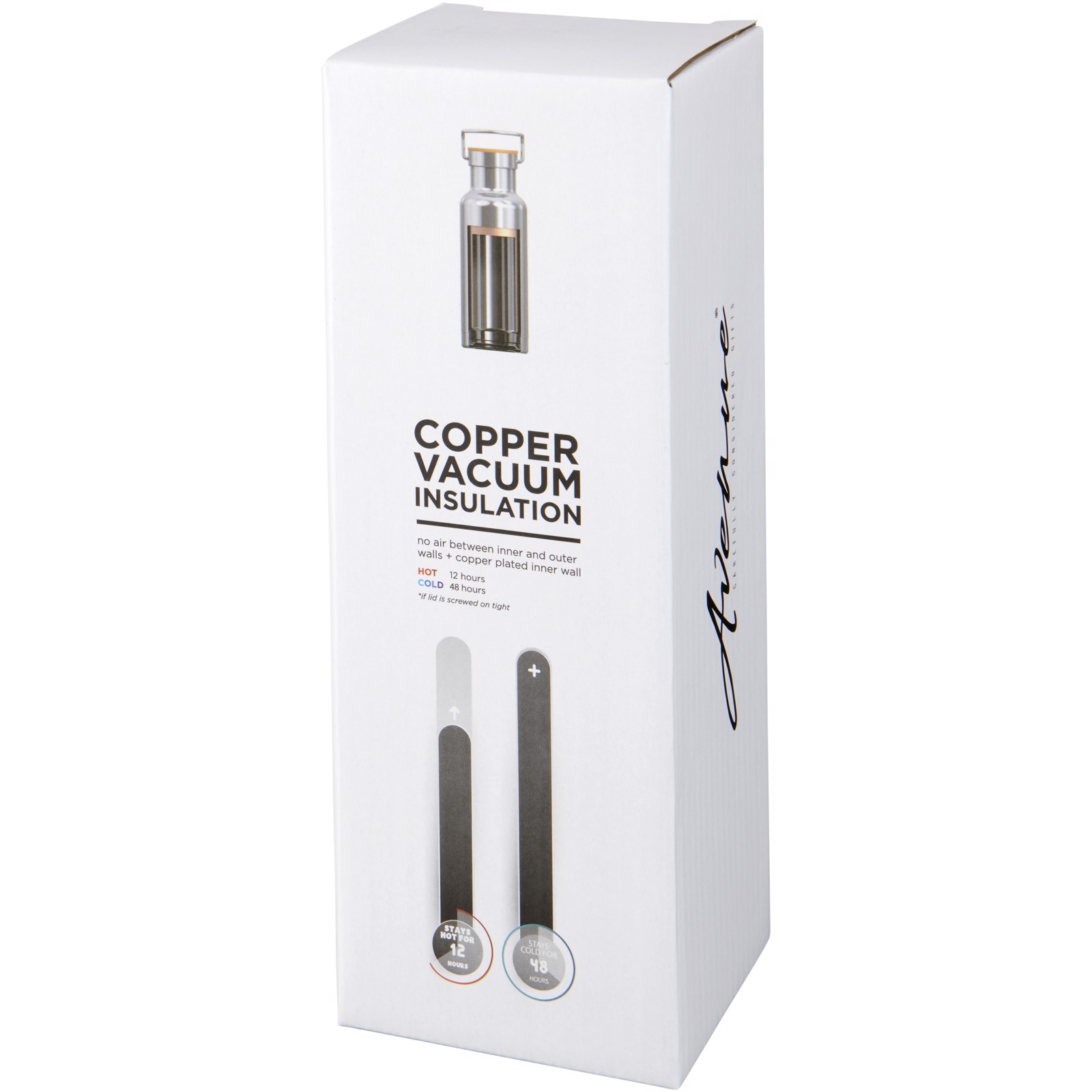Design à double-paroi sous vide en acier inoxydable, avec isolation en cuivre, pour garder votre boisson froide pendant 48 h et chaude pendant 12 h au moins. Le design empêche également la formation de condensation à l’extérieur de la bouteille. Couvercle à visser avec détails en bois. Revêtement en poudre durable et à la mode. Capacité de 480ml. Présentée dans une boîte cadeau Avenue.