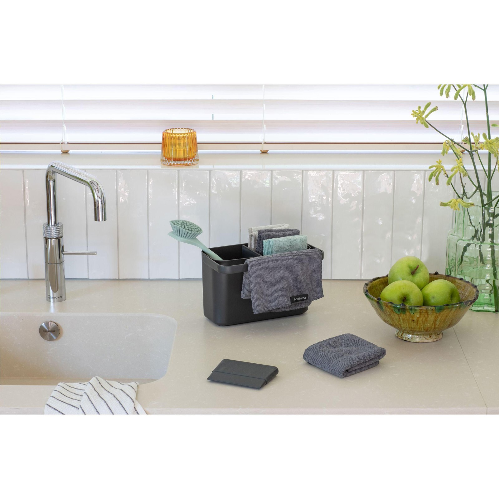 Kit de nettoyage en plastique Brabantia pour le plan de travail ou le placard de cuisine. Vous avez ainsi tous vos accessoires de nettoyage à portée de main. Comprend : • un bac avec 3 éponges en microfibre (16 x 22 cm), 2 chiffons de nettoyage en microfibre (25 x 30 cm) de différentes couleurs pour différentes tâches • un grattoir multifonctionnel pour les assiettes, plats et casseroles, plan de travail et évier • brosse à vaisselle avec grattoir intégré pour éliminer les résidus tenaces • séparateur flexible • grande poignée ergonomique, également pour suspendre votre chiffon de nettoyage • bac d'égouttage pour recueillir l'eau et permettre l'aération • dessous antidérapant. Un super ensemble pour un nettoyage rapide. Fabriqué à partir de 64% de matériaux recyclés. Recyclable à 82%. Avec 5 ans de garantie fabricant. Emballé par set.