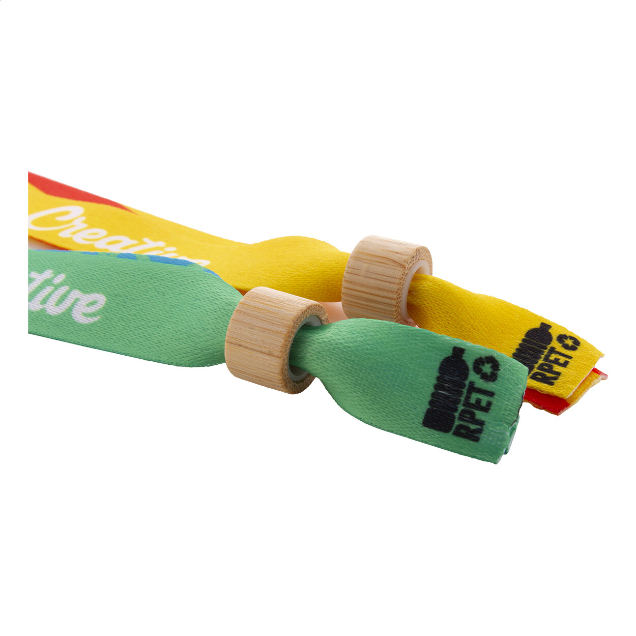 Bracelet festival en polyester RPET sur mesure avec fermoir de sécurité en bambou. Impression en sublimation des deux côtés. Quantité minimale : 100 pièces.