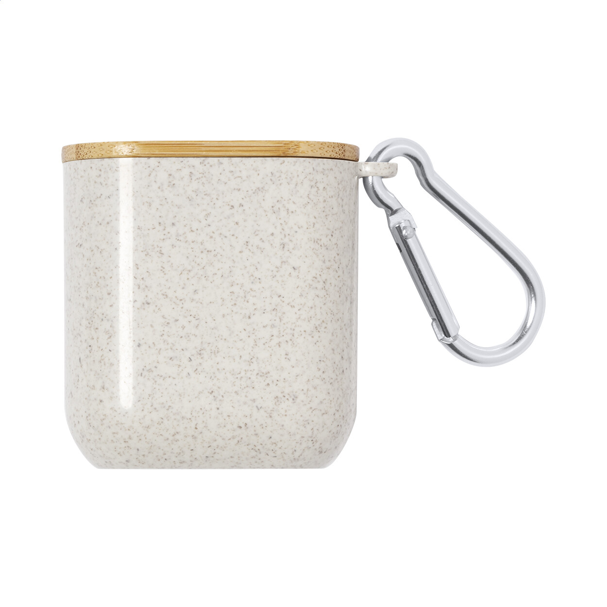 Câble de chargement USB dans un étui écologique en plastique en paille de blé avec mousqueton et couvercle porte téléphone portable en bambou. Avec connecteurs micro USB, USB-C et Lightning. Avec entrées USB et USB-C.