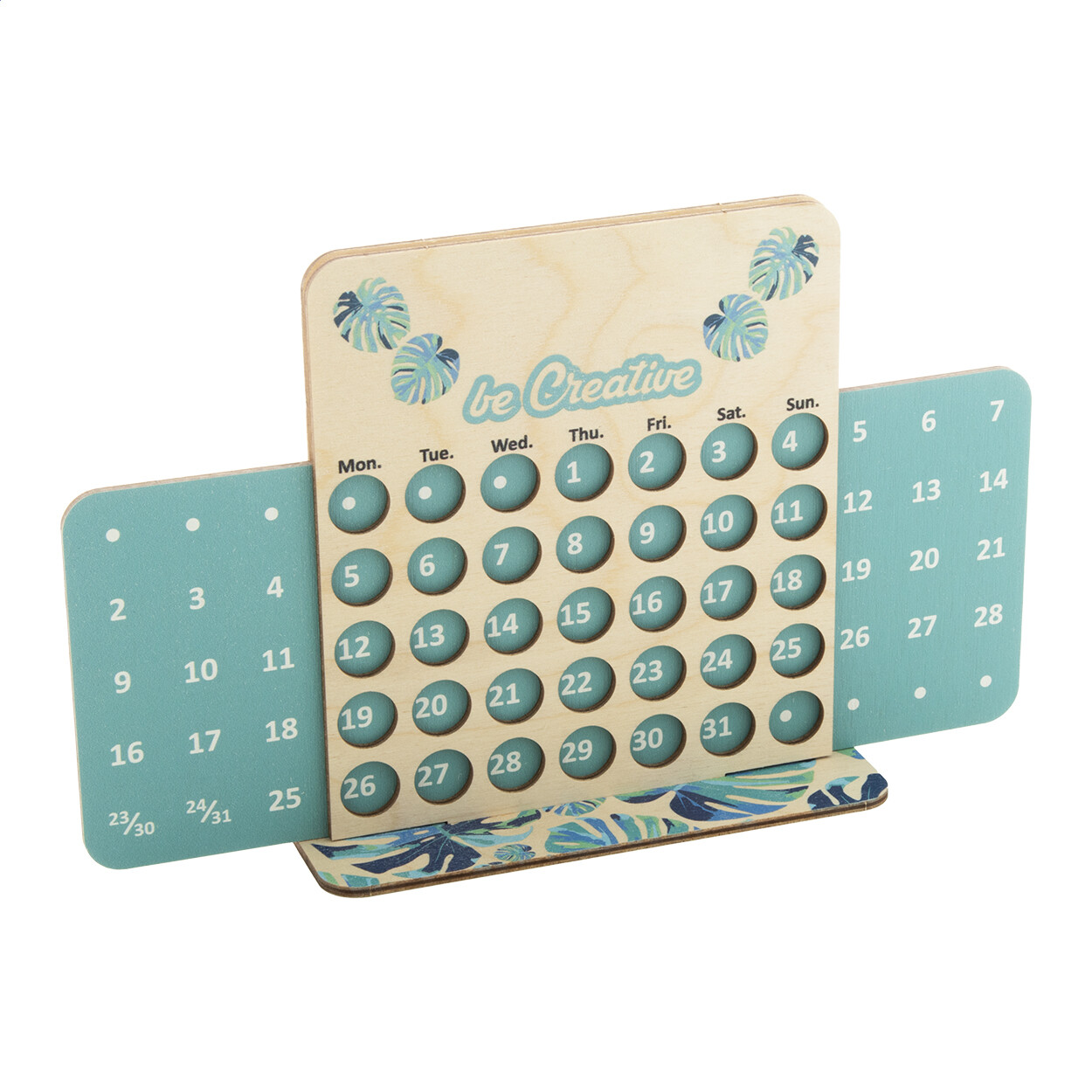 Calendrier de bureau perpétuel sur mesure en contreplaqué de bouleau. Le prix comprend l’impression quadri sur le recto et la base. Livré à plat. Quantité minimale : 50 pièces.