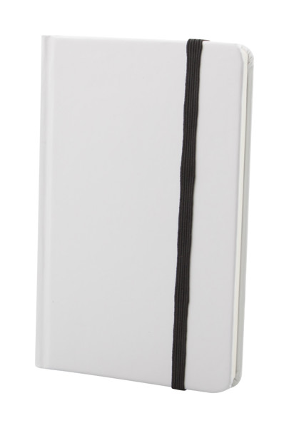 Carnet de notes de 80 pages non lignées avec couverture en carton blanc et élastique en caoutchouc de couleur. Format A6.