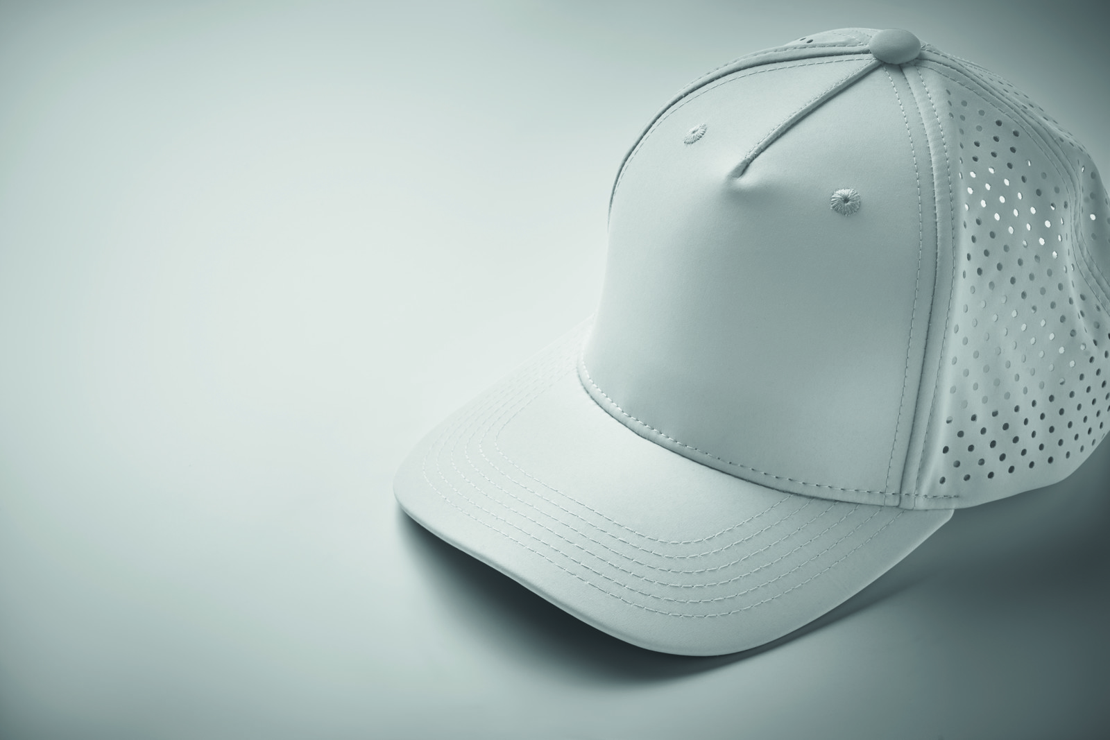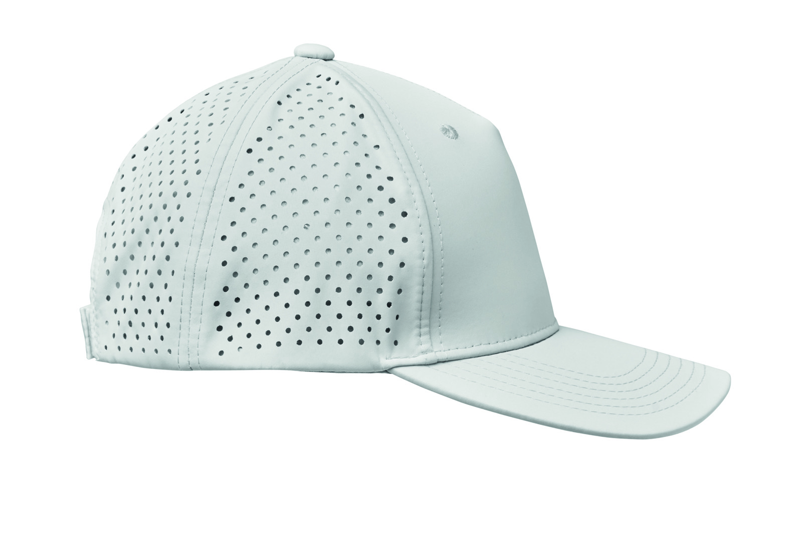Casquette en polyester 5 panneaux avec fermeture auto-agrippante réglable. 4 panneaux perforés. Panneau avant avec 2 œillets cousus de couleur assortie. L'article sèche rapidement et est déperlant. 130 gr/m²