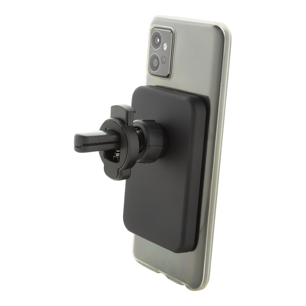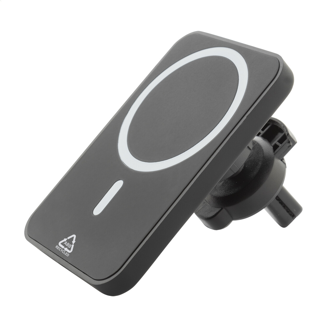 Support magnétique pour téléphone portable dans un boîtier en ABS recyclé avec chargeur rapide sans fil intégré (15 W) et fixation réglable sur grille d'aération. Anneau métallique autocollant inclus pour utiliser la fonction magnétique sur tout appareil rechargeable sans fil. Compatible avec iPhone® 12 ou plus récent. Câble chargeurment USB inclus.
