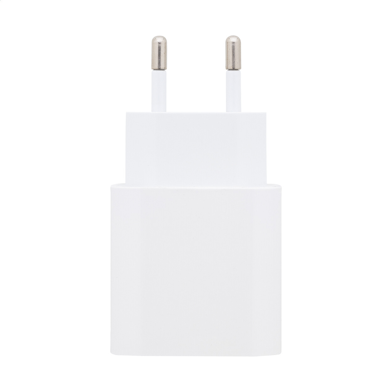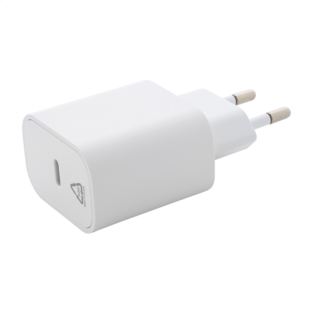 Chargeur mural USB à charge rapide en ABS recyclé 1 port USB-C. Prend en charge la technologie de charge rapide (PD20W / QC3.0). Avec prise européenne à 2 pôles.