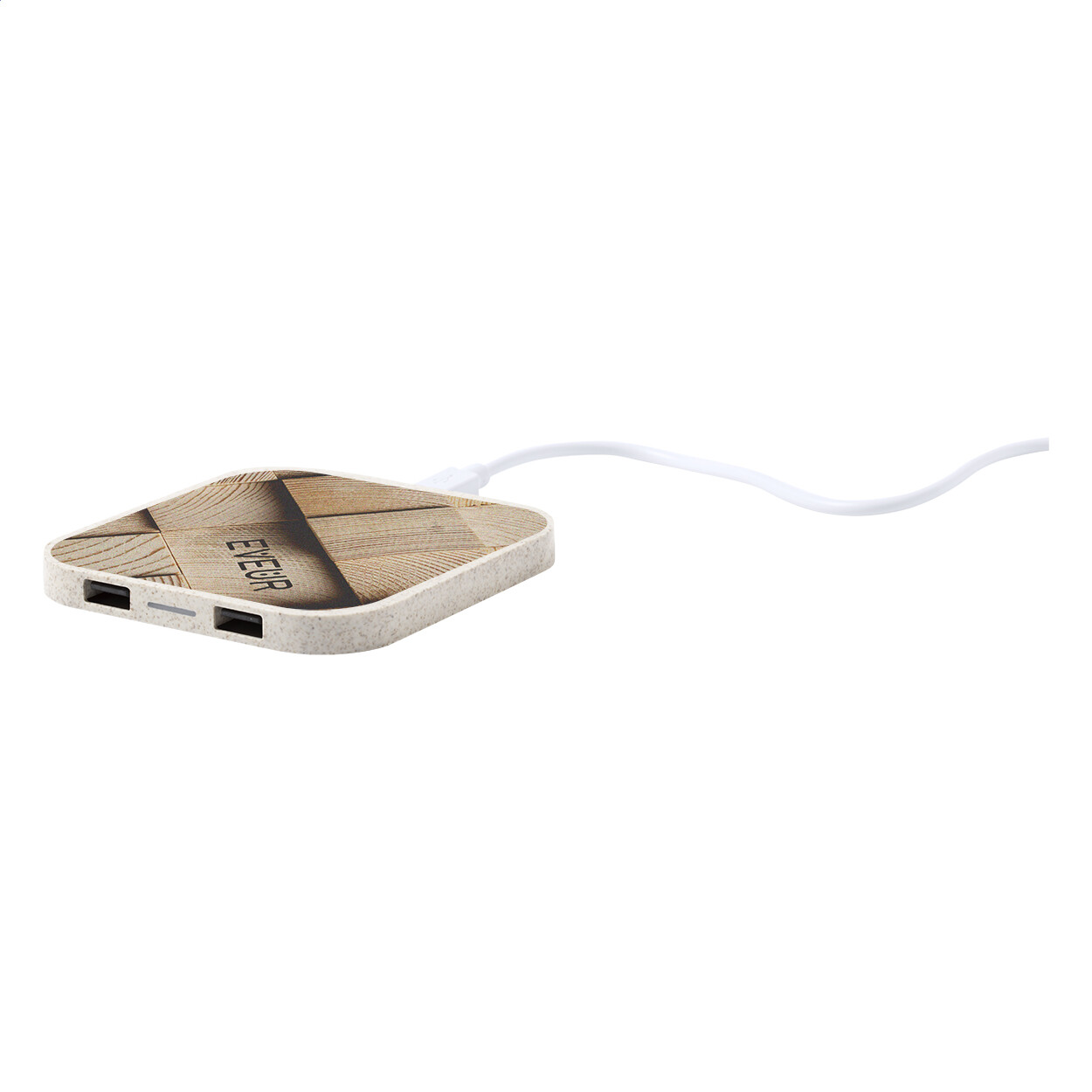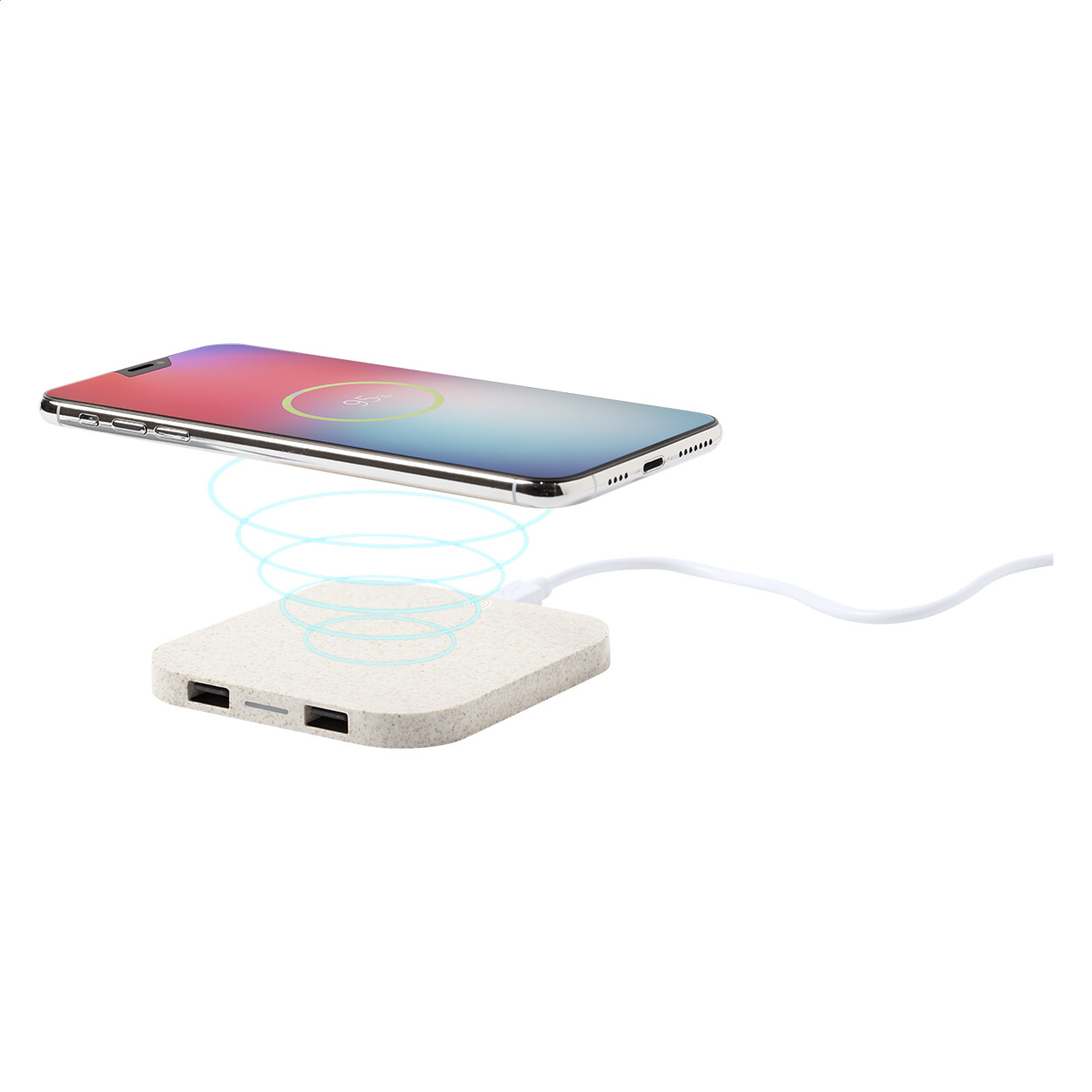 Chargeur indiction sans fil en paille de blé avec 2 ports USB. Sortie maximale 2100 mA. Câble USB inclus.