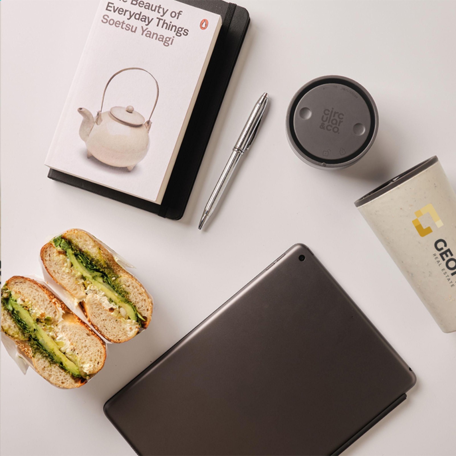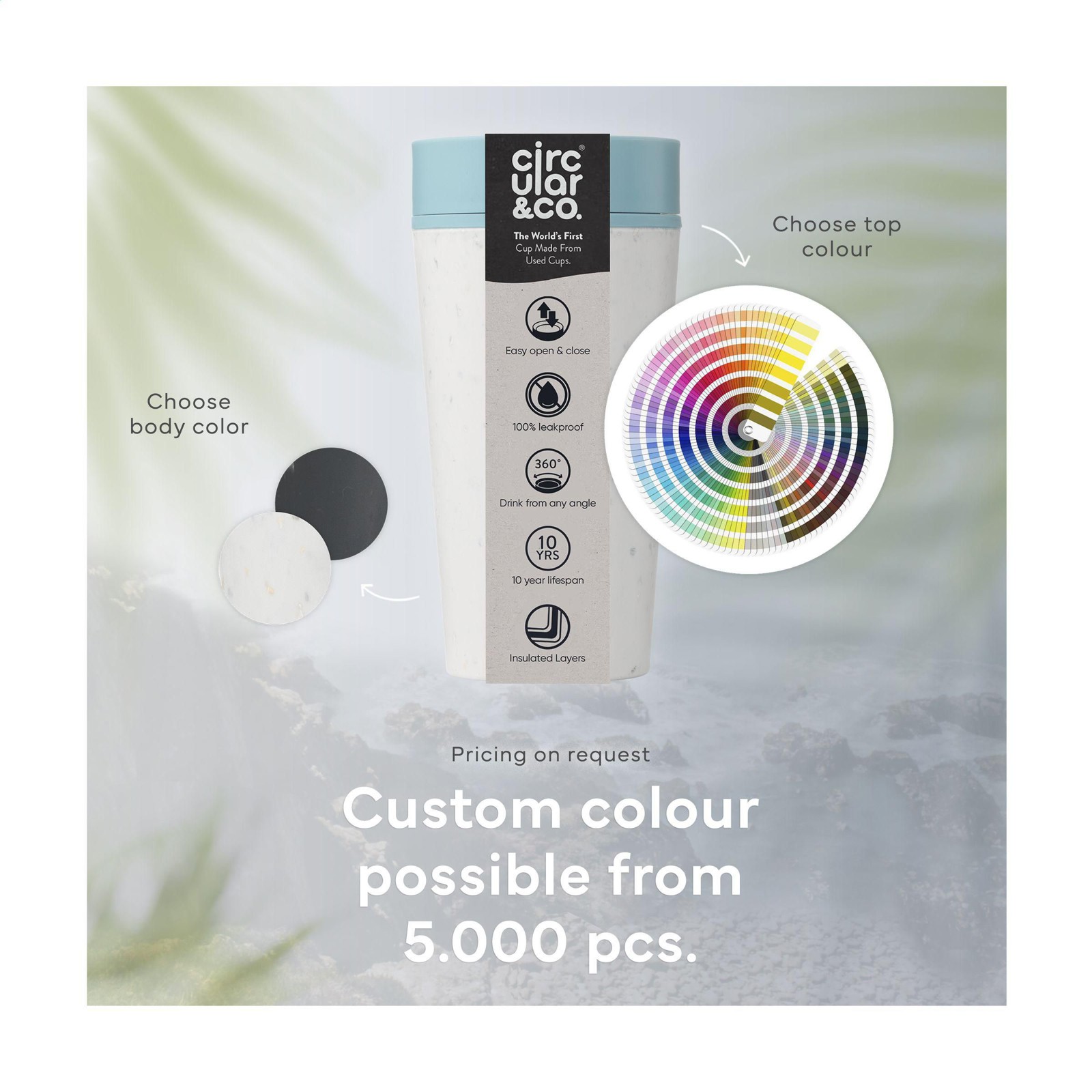 Tasse à café circulaire réutilisable à double paroi avec couvercle de Circular&Co. La couche isolante extérieure de cette tasse est fabriquée à partir de gobelets à café en papier à usage unique usagés et recyclés. La paroi intérieure et le couvercle sont en PP. 100% sans fuite. L'effet isolant permet de garder votre boisson chaude plus chaude et votre boisson froide plus froide plus longtemps. Le couvercle est conçu avec une technologie brevetée à 360 degrés, qui vous permet de siroter sous n'importe quel angle. La tasse à café peut être ouverte et fermée d'une seule main et d'un seul clic. Idéal pour les déplacements. 100% recyclable. Passe au lave-vaisselle. Le lavage à la main est recommandé pour préserver l’impression. Capacité 340 ml. INFORMATIONS SUPPLÉMENTAIRES : Avec une commande minimum de 5 000 pièces, le couvercle de ce produit est disponible dans n'importe quelle couleur PMS. De cette façon, vous créez une correspondance parfaite entre le produit et l'impression.