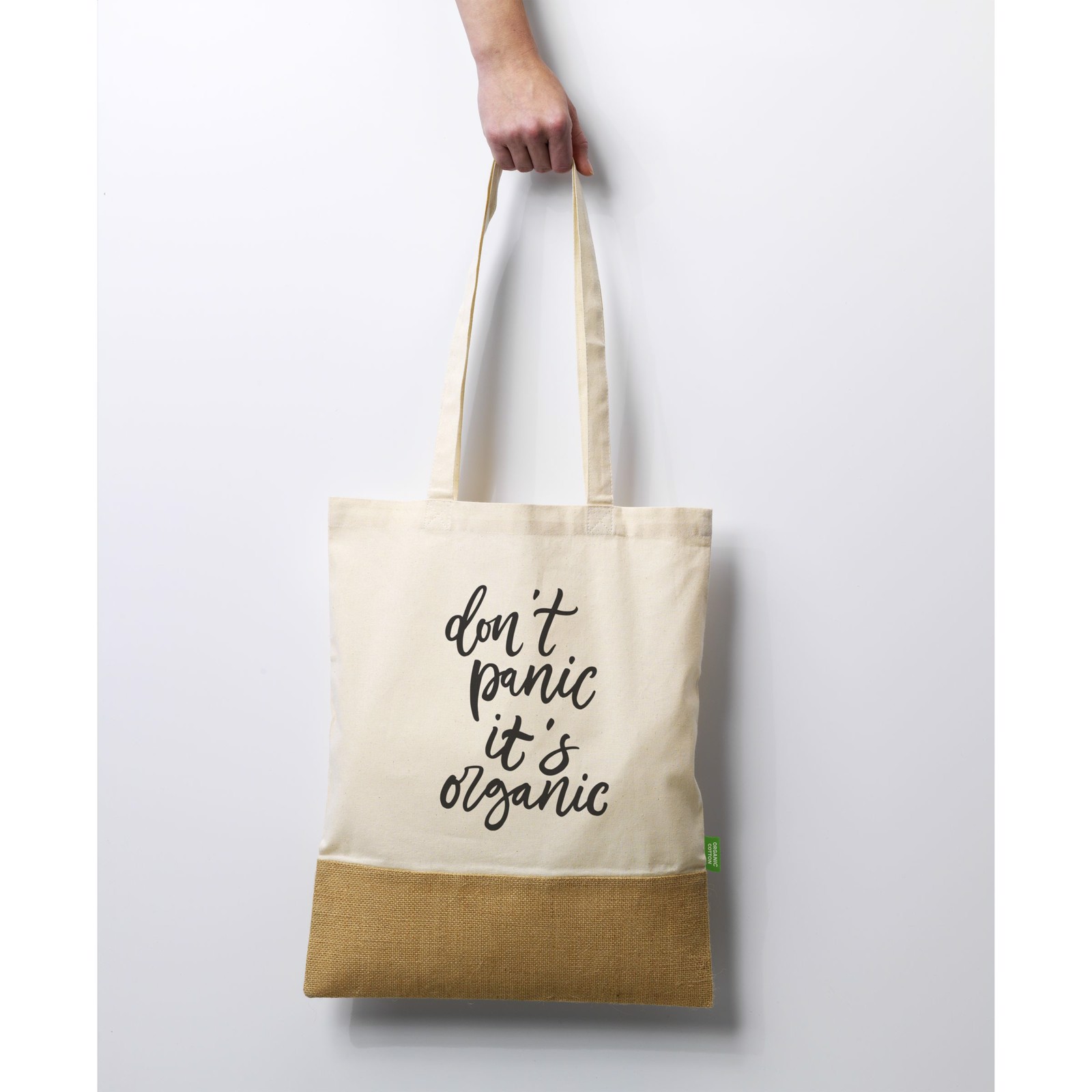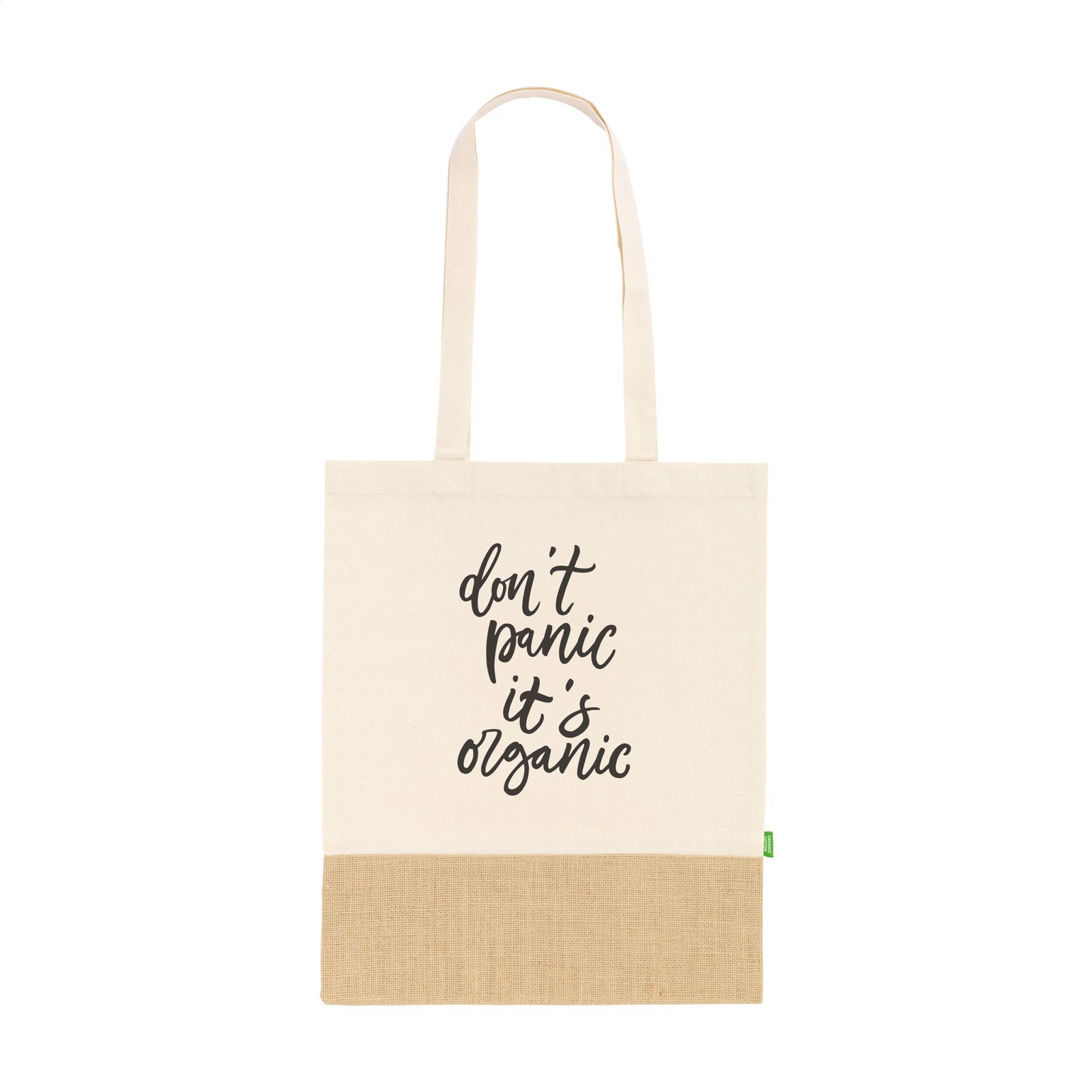 Le sac Chimborazo : 70 % coton recyclé, 30 % rPET, fond en liège, 180 g/m², anses 65 cm, capacité 15 L, supporte jusqu’à 12 kg, dimensions 40 × 38 × 8 cm.