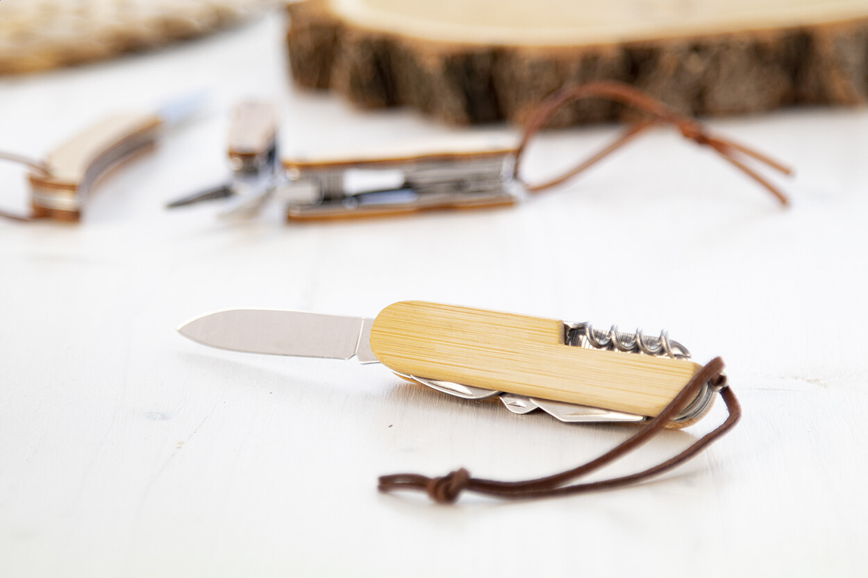 Couteau de poche multifonctions en acier inoxydable avec manche en bambou et 9 fonctions. Avec bandoulière en similicuir.