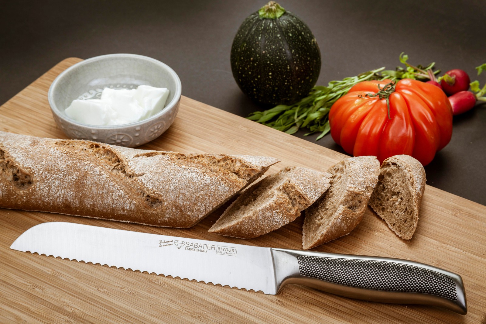 La planche à découper Brancusi en bambou, avec des dimensions de 28 x 39 x 4,5 cm, possède une rigole tout autour de son périmètre. Elle cache un tiroir coulissant renfermant trois couteaux de cuisine — un couteau à pain, un couteau de chef et un couteau à légumes. Livrée dans une boîte individuelle en kraft.