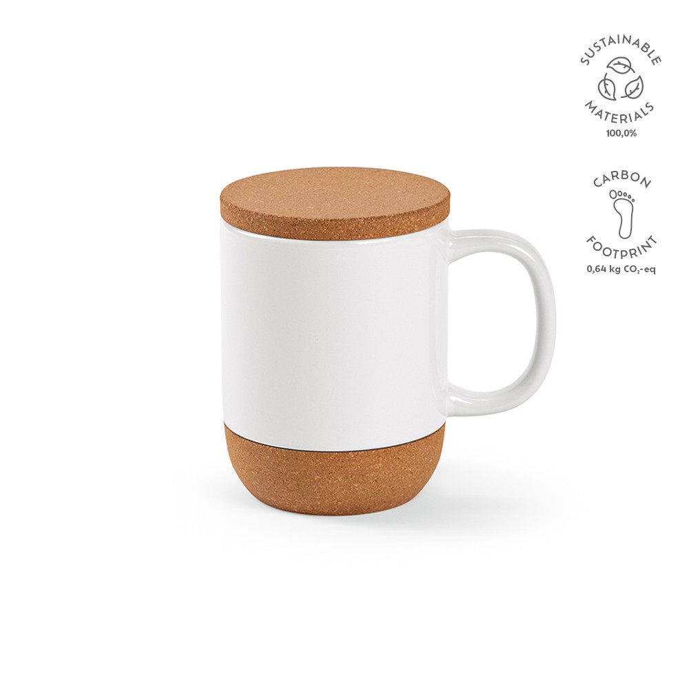Le mug Ebro de 430 ml (350 ml pour les liquides) est en céramique, avec un couvercle et une base écologiques en liège. Il résiste à 125 lavages au lave-vaisselle (sans le couvercle ni la base). Le couvercle protège la boisson contre les éclaboussures et la base en liège est antidérapante. Un modèle distingué et naturel, la combinaison parfaite du style et de la praticité. Emballé dans une boîte individuelle.