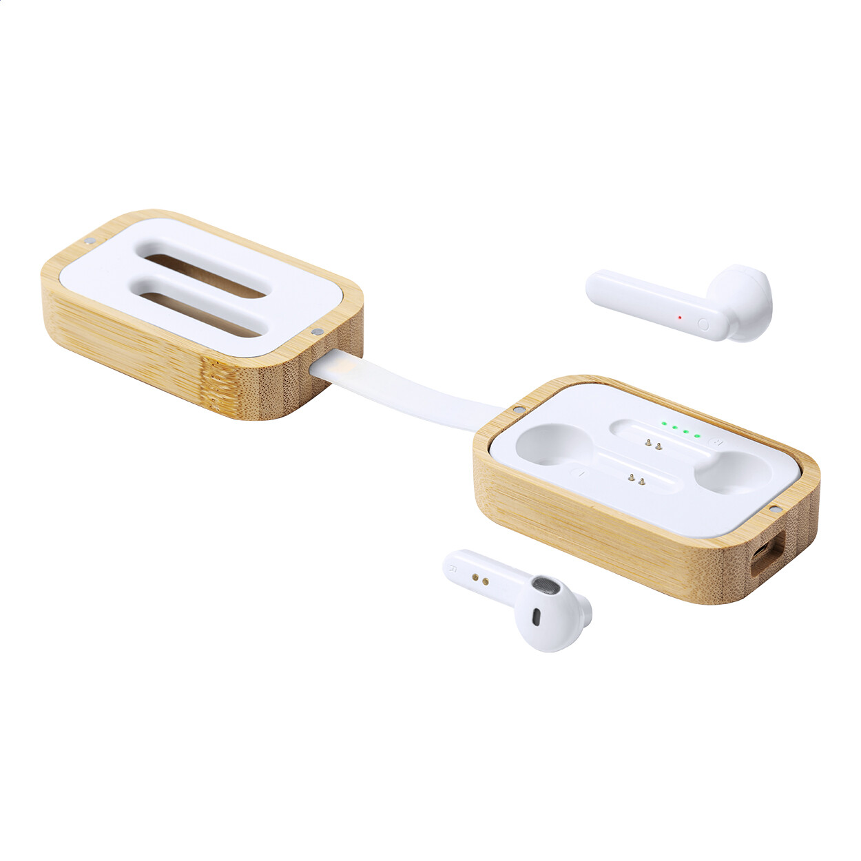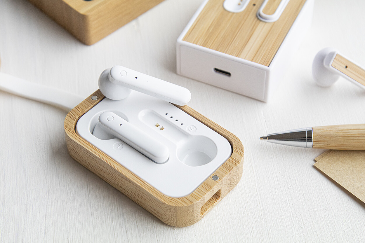 Écouteurs stéréo sans fil (TWS) avec fonction d'appel mains libres dans un étui chargeur en bambou. Câble de chargement USB inclus.