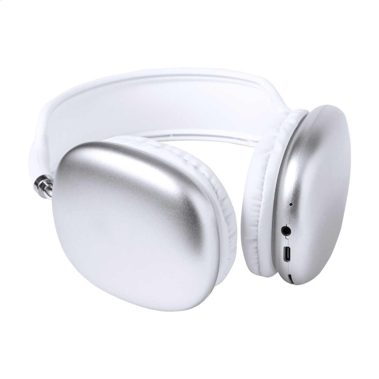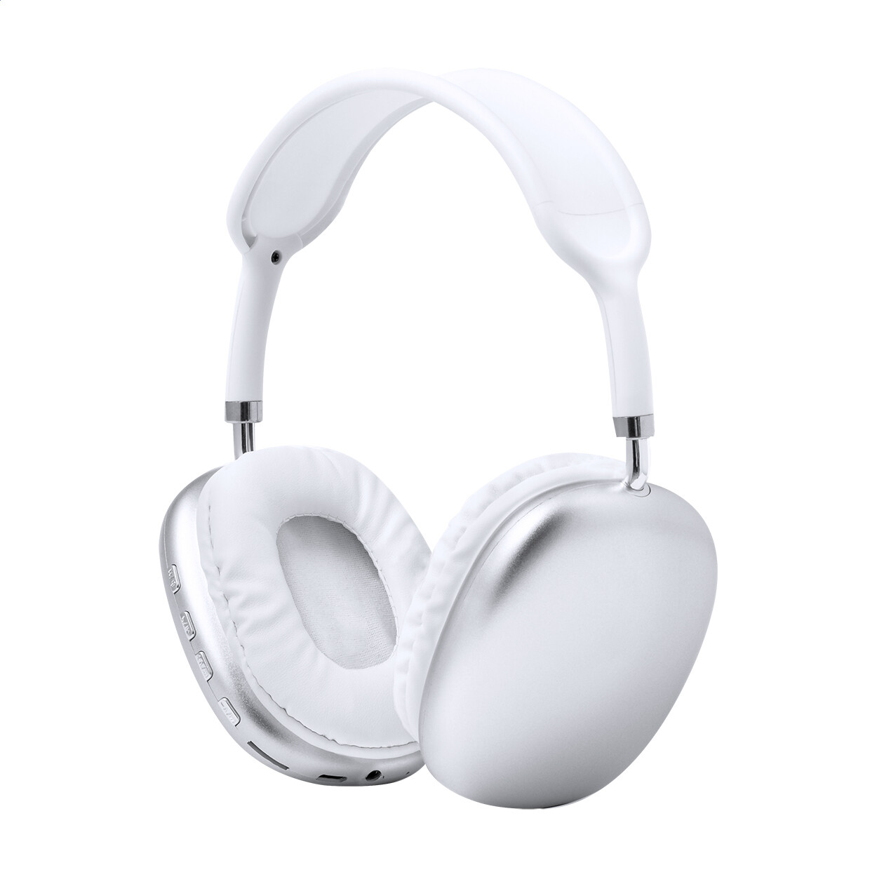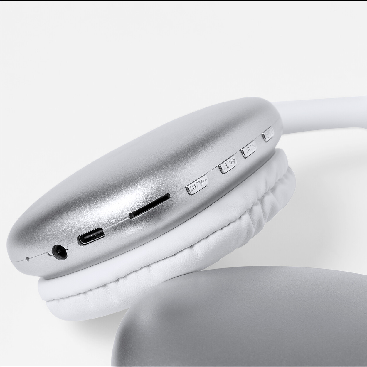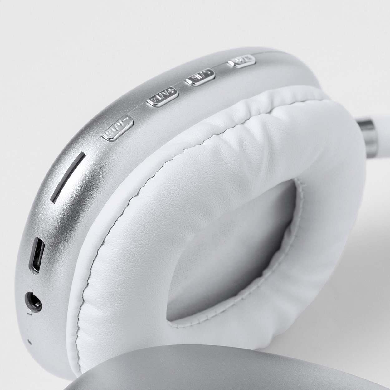 Casque sans fil en plastique ABS avec oreillettes en cuir PU et batterie rechargeable intégrée. Fonctions d'appel mains libres et de lecture de fichiers MP3 sur micro SD. Câble audio de 3,5 mm et câble de chargement USB inclus.