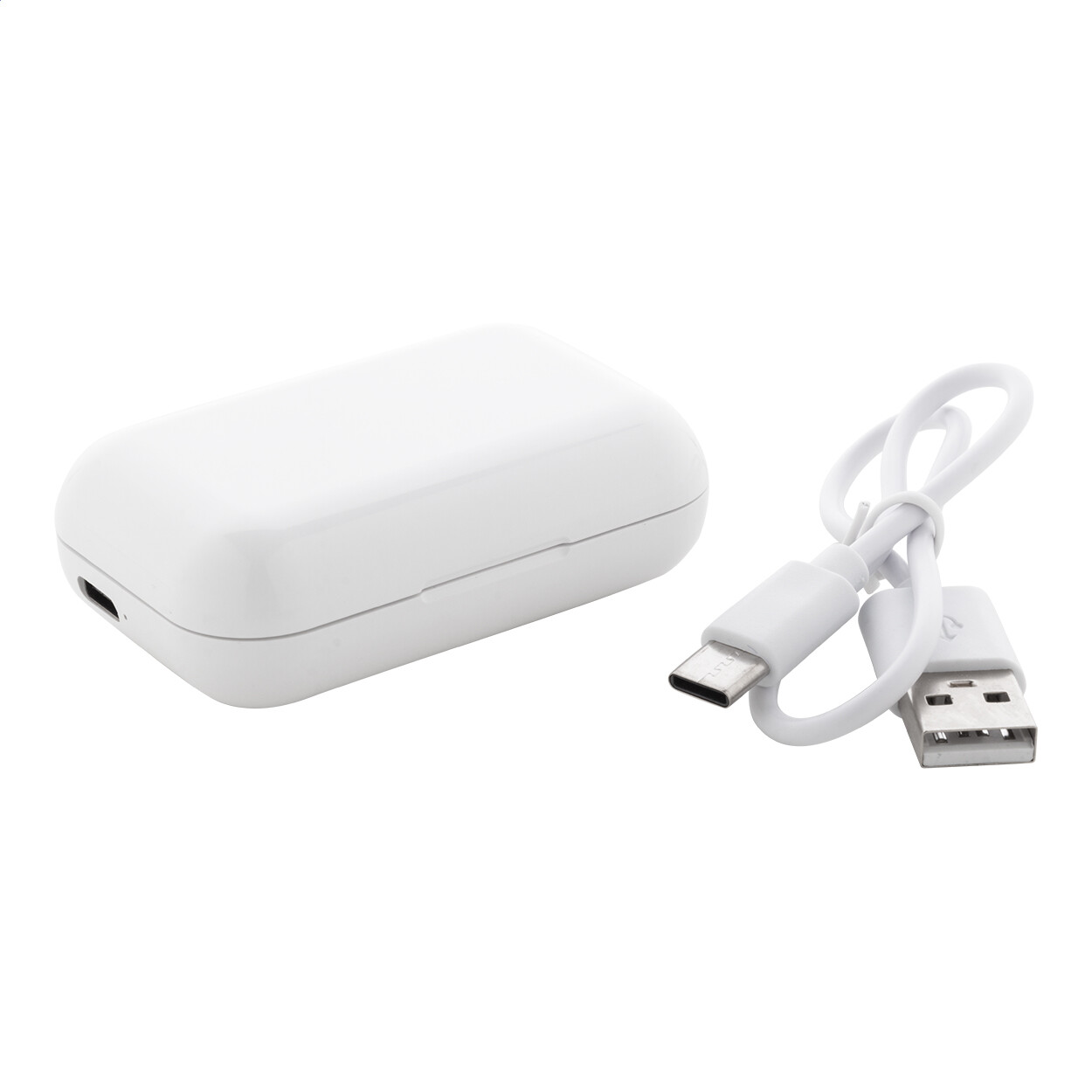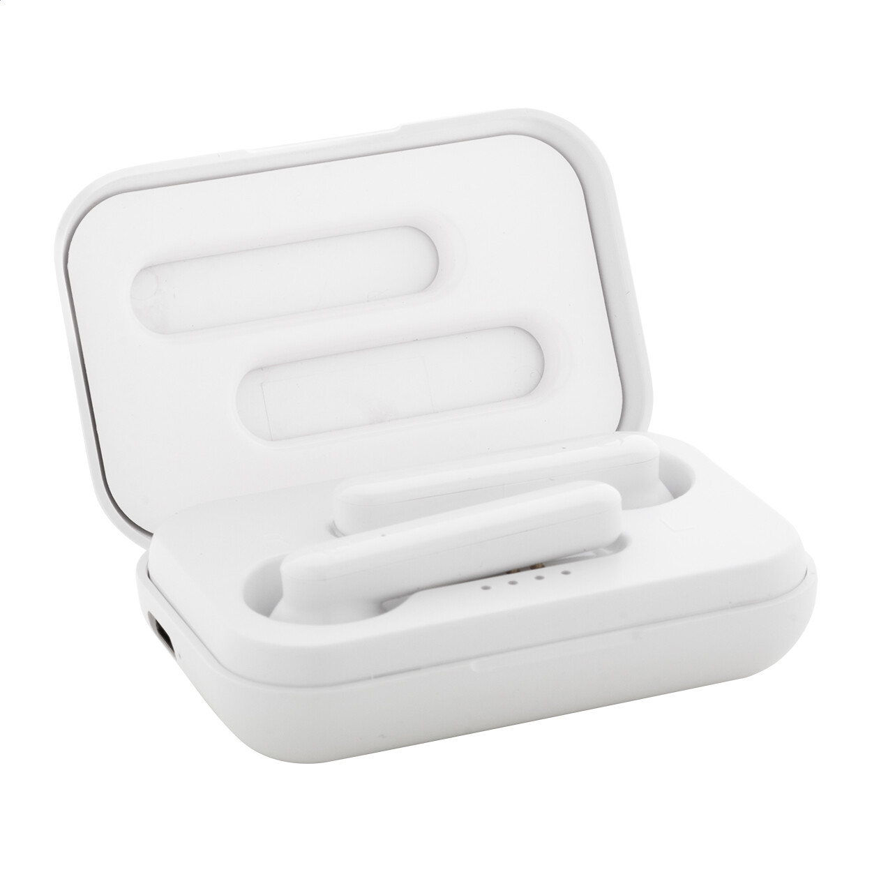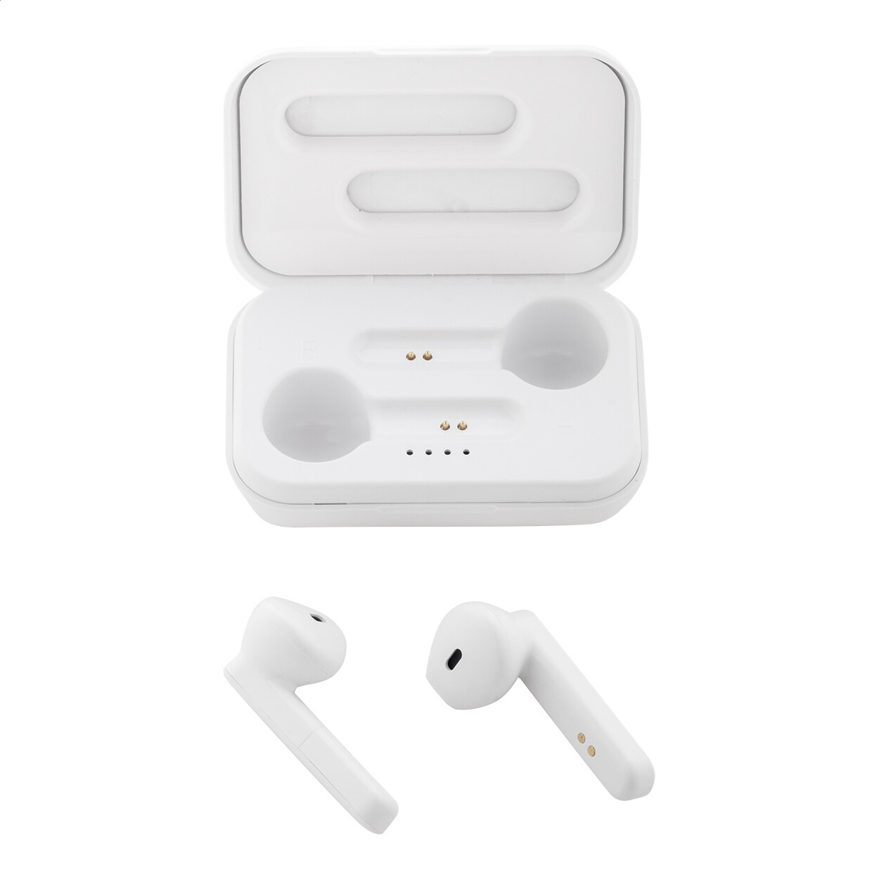 Écouteurs stéréo sans fil (TWS) en plastique ABS recyclé avec fonction d'appel mains libres, dans un étui chargeur en plastique avec une batterie de 400 mAh. Câble de chargement USB inclus.