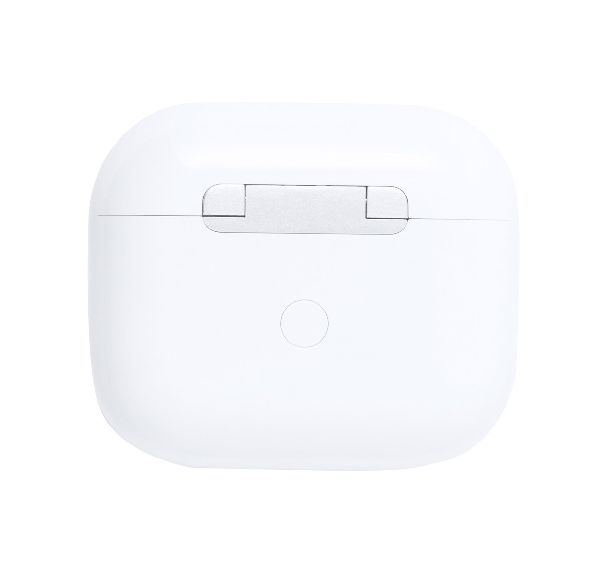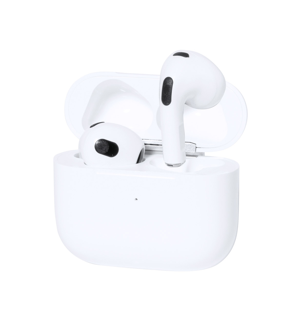 Écouteurs stéréo sans fil (TWS) avec fonction d'appel mains libres dans un étui chargeur en plastique. Câble de chargement USB inclus.