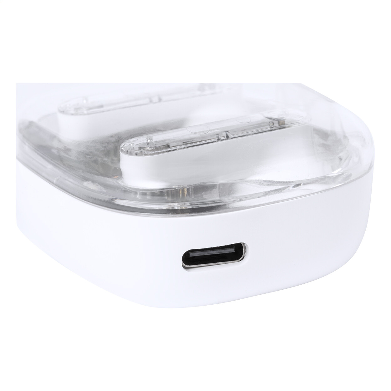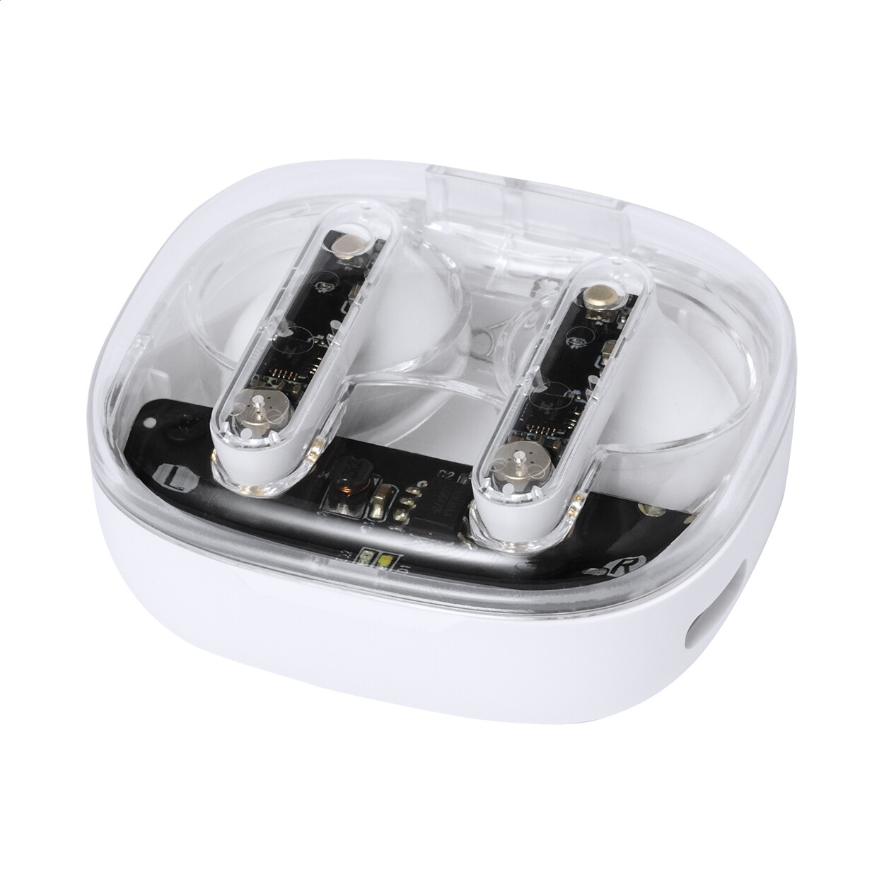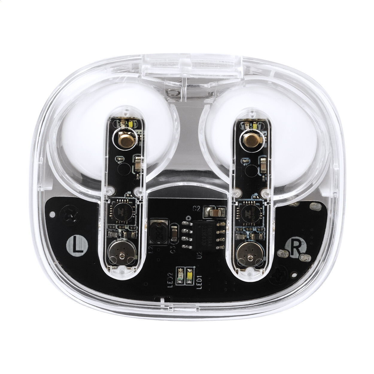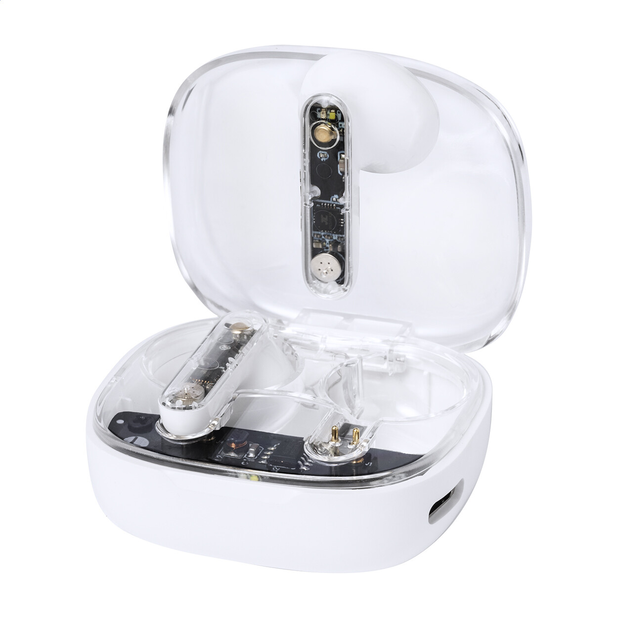 Écouteurs stéréo sans fil (TWS) semi-transparents avec composants électroniques visibles et fonction d'appel mains libres. Dans un étui de chargement en plastique semi-transparent. Câble de chargement USB inclus.